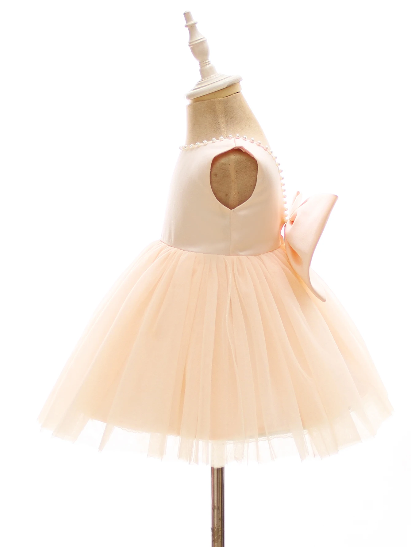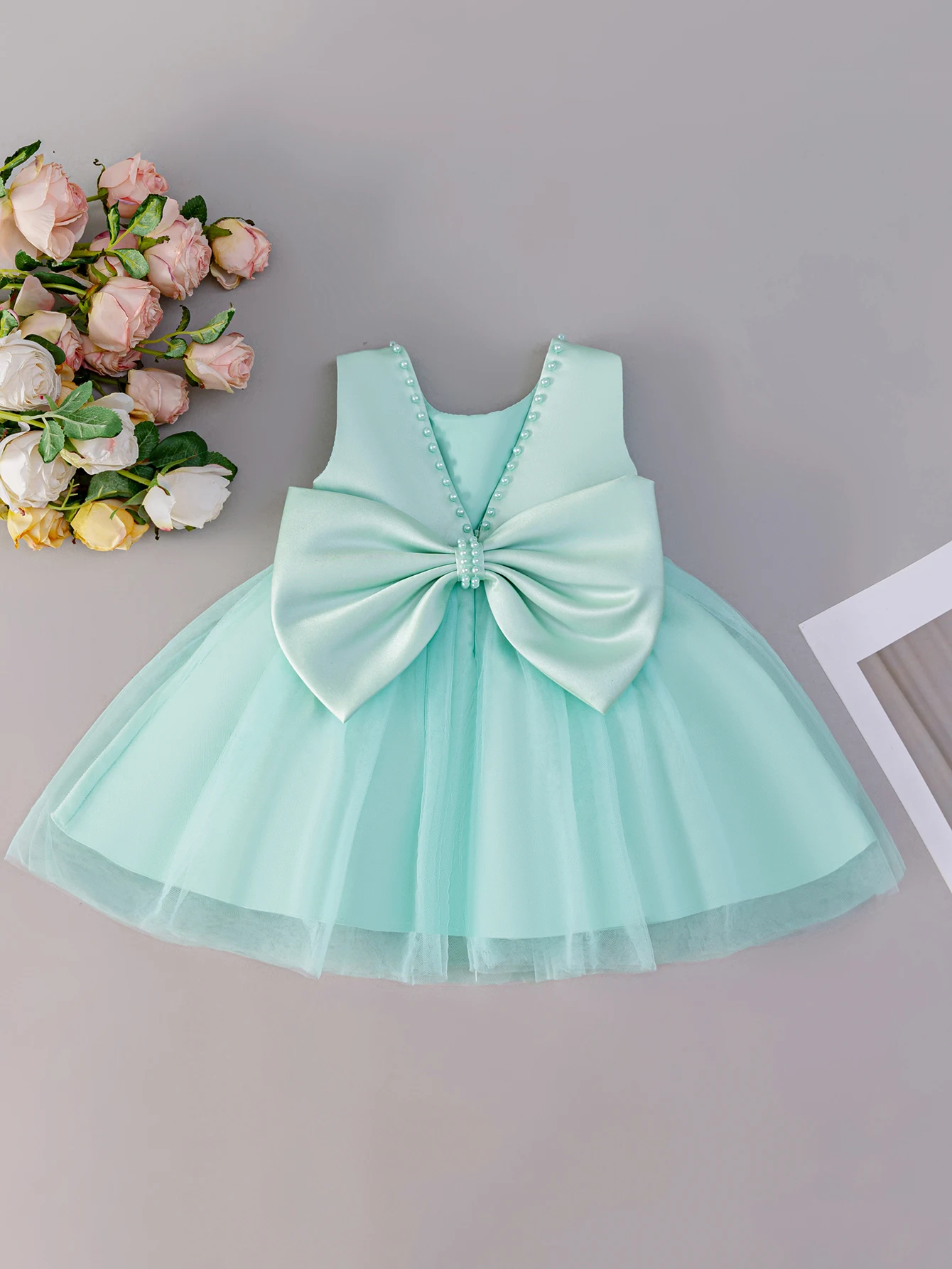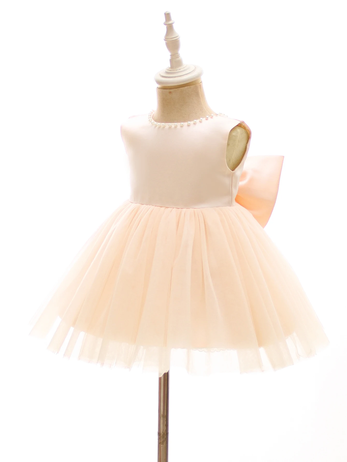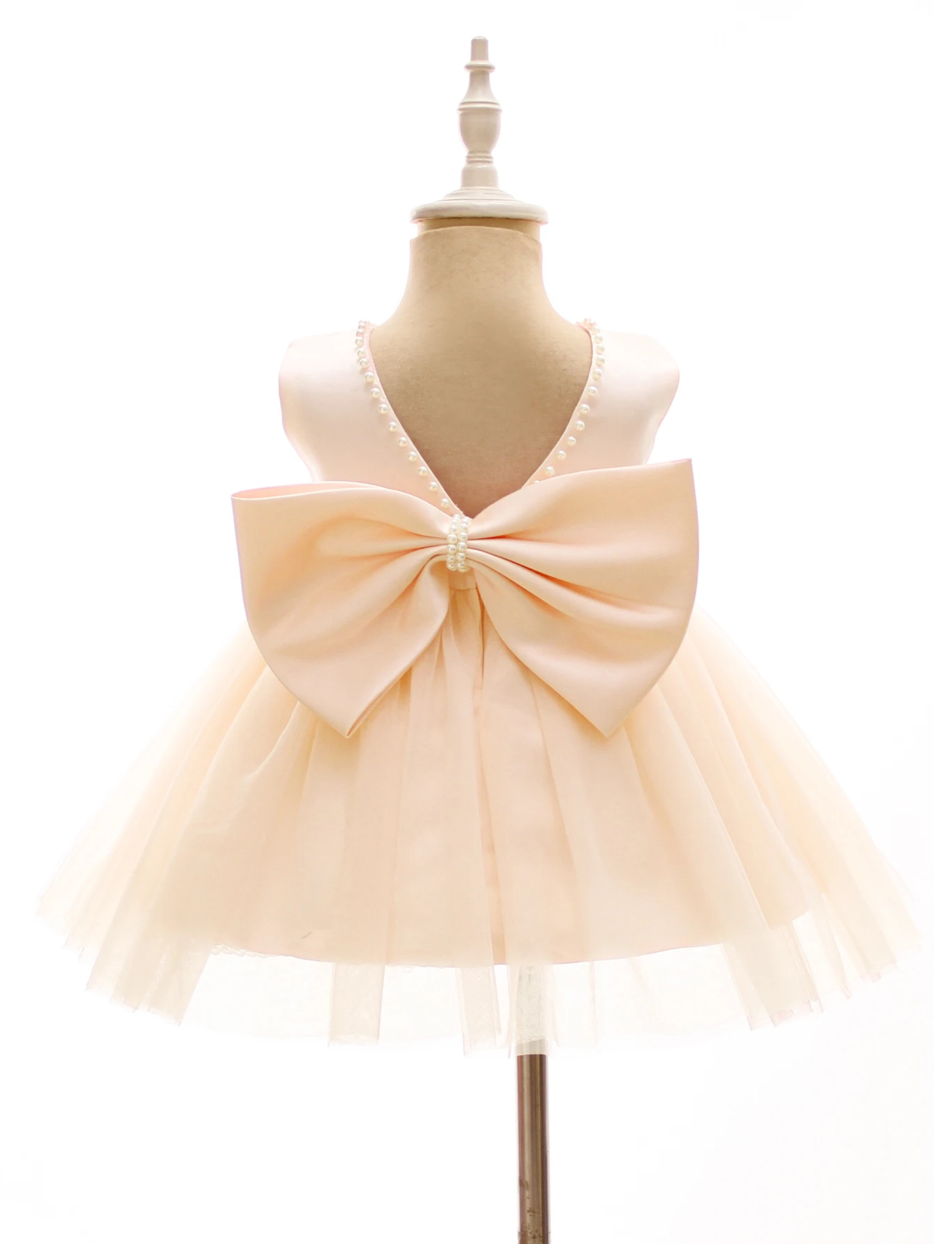 Sleeveless Satin Beaded Chiffon Dress With Large Bow Suitable For Baby Baptism Wedding Flower Girl Party Dress