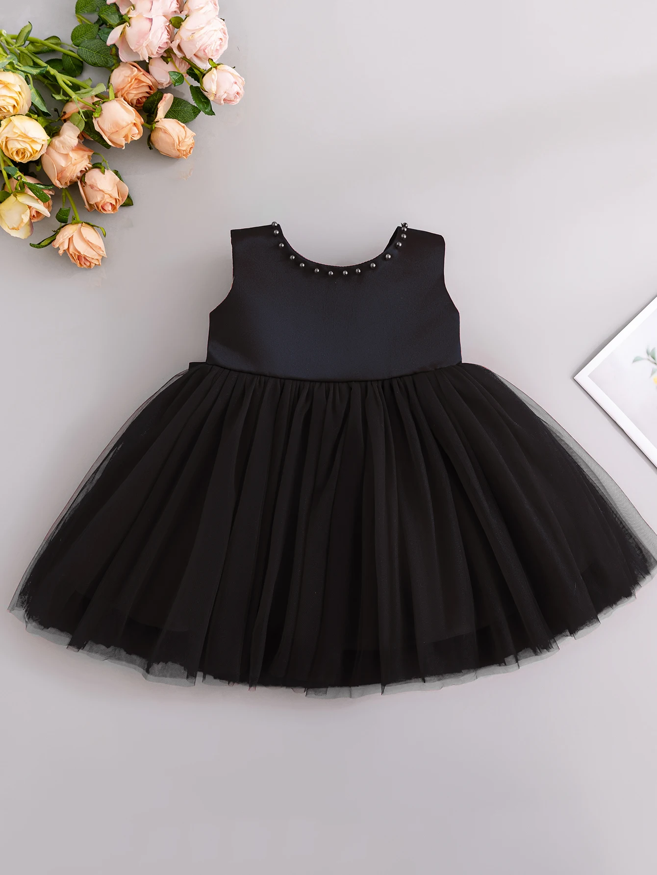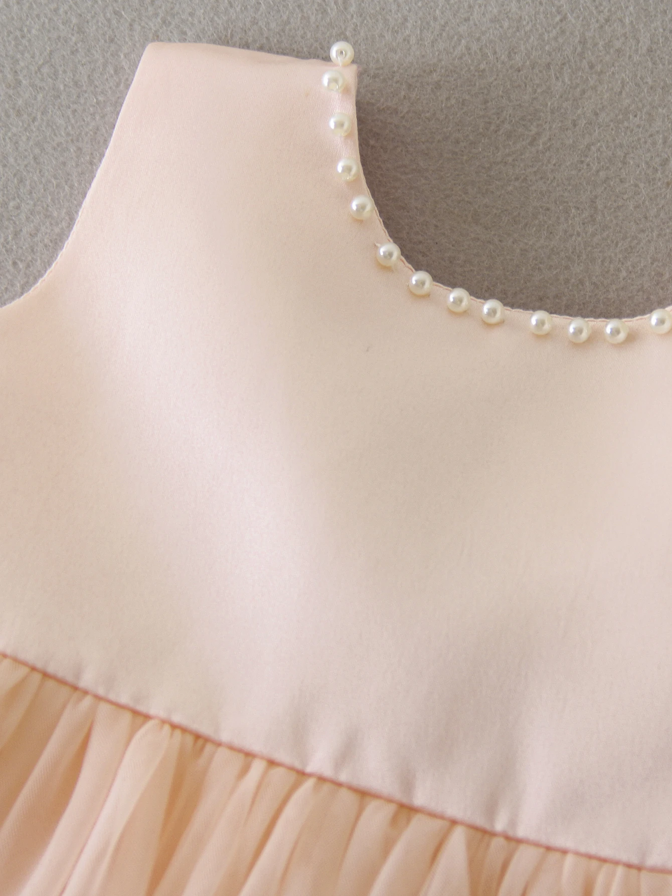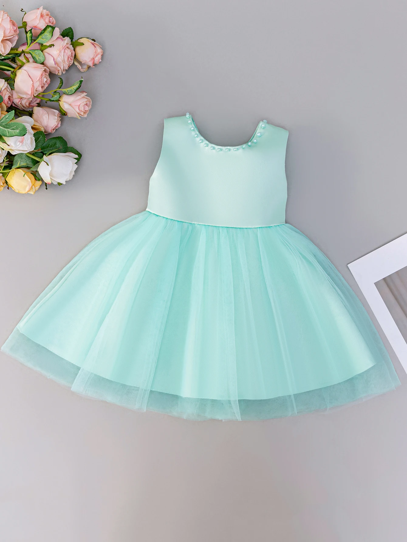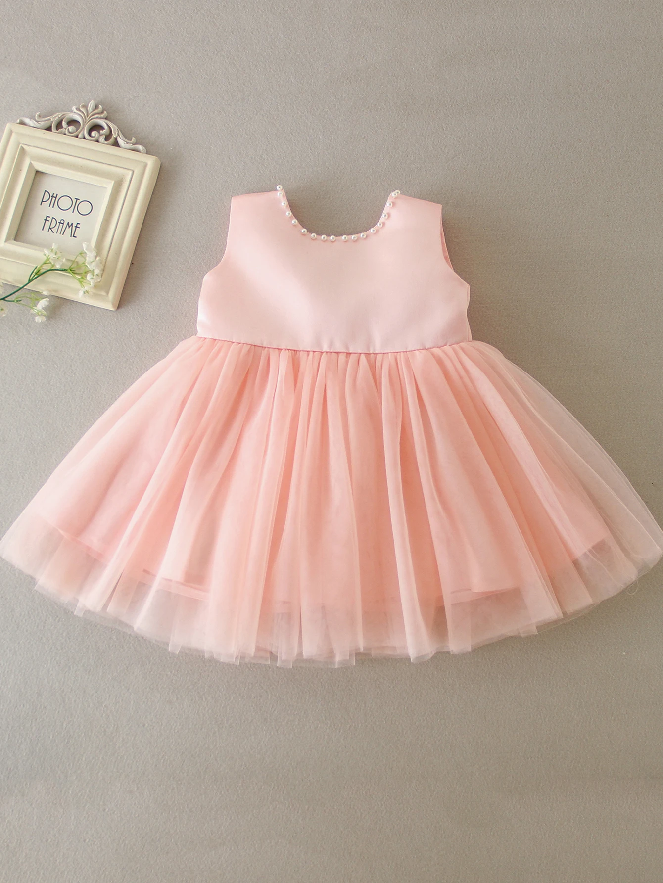 Sleeveless Satin Beaded Chiffon Dress With Large Bow Suitable For Baby Baptism Wedding Flower Girl Party Dress
