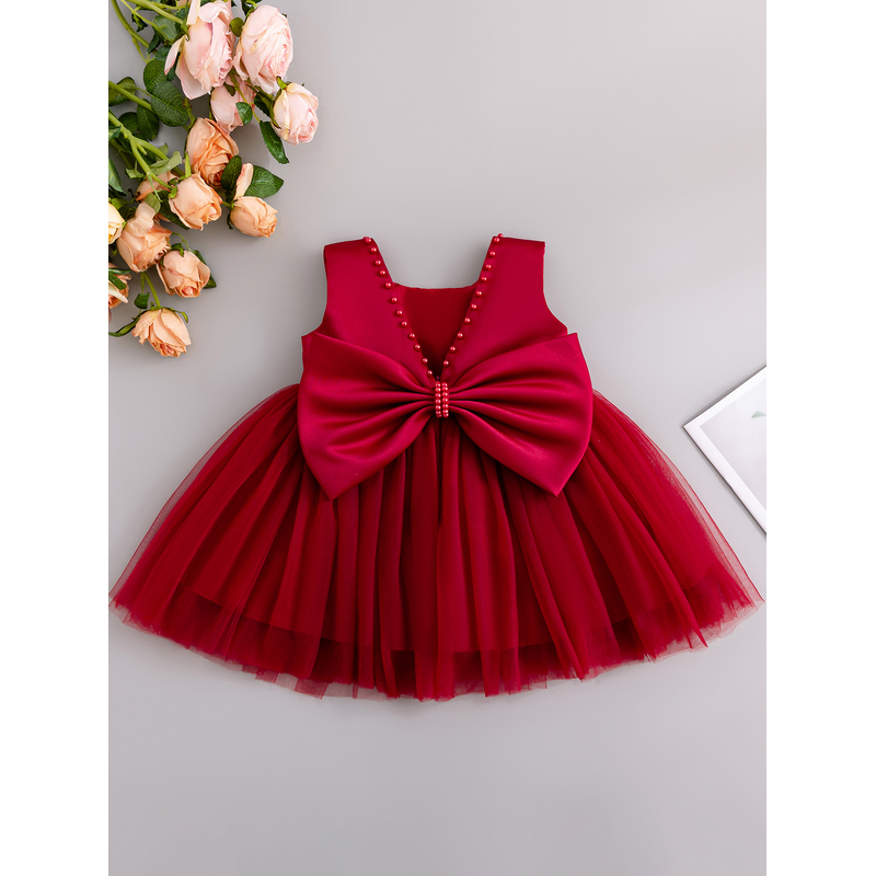 Sleeveless Satin Beaded Chiffon Dress With Large Bow Suitable For Baby Baptism Wedding Flower Girl Party Dress