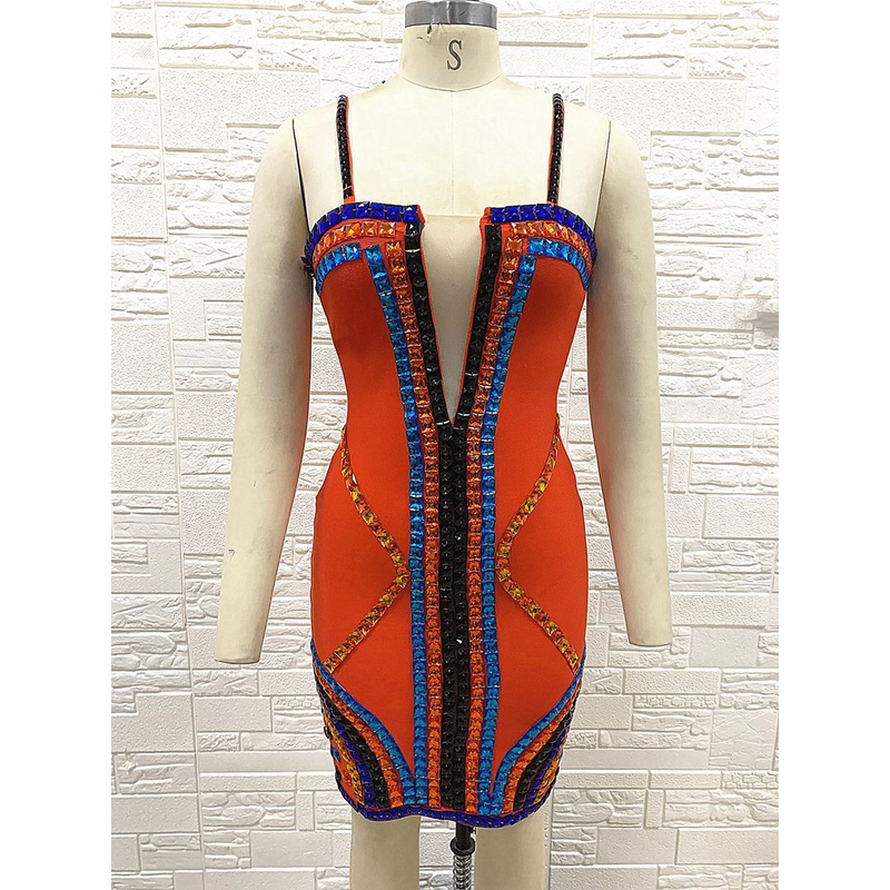 Sleeveless Women's Luxury Diamond Bandage Dress Sexy Waist - Tucked Gown Orange S