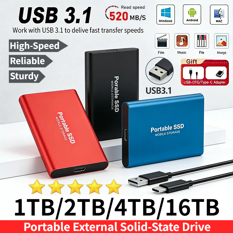 Slim Portable SSD 1TB External Solid State Drive 2TB/4TB USB3.2 Gen 2 Ultra Fast Transfer Hard Drive 16TB for Laptop/Desktop/MAC