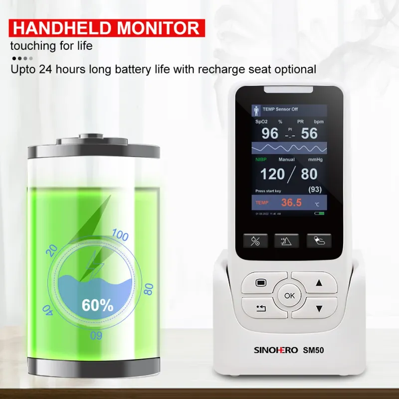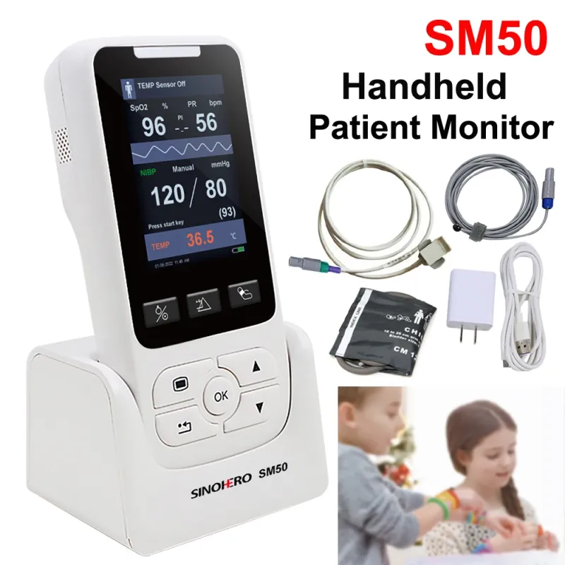 SM50 is a multi-functional hand-held patient monitor that can monitor SpO2, NIBP TEMP PR at the same time. the device is widely applicable to hospital wards, community clinics, Fimily and other medical institutions.