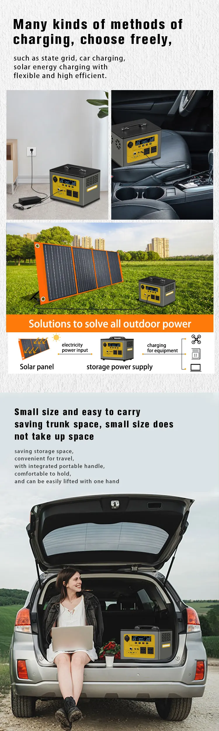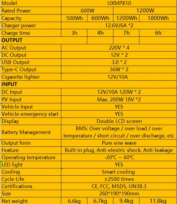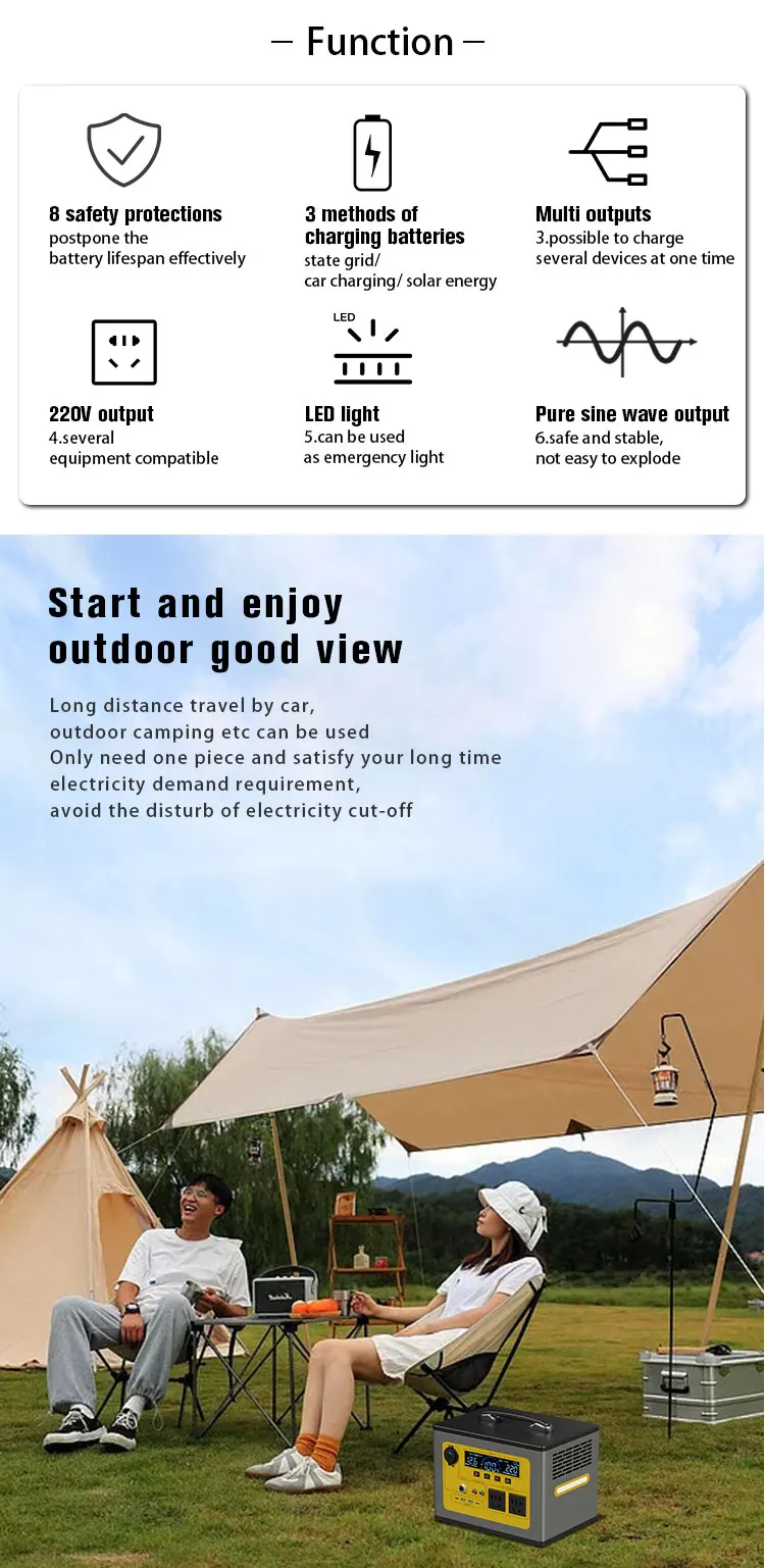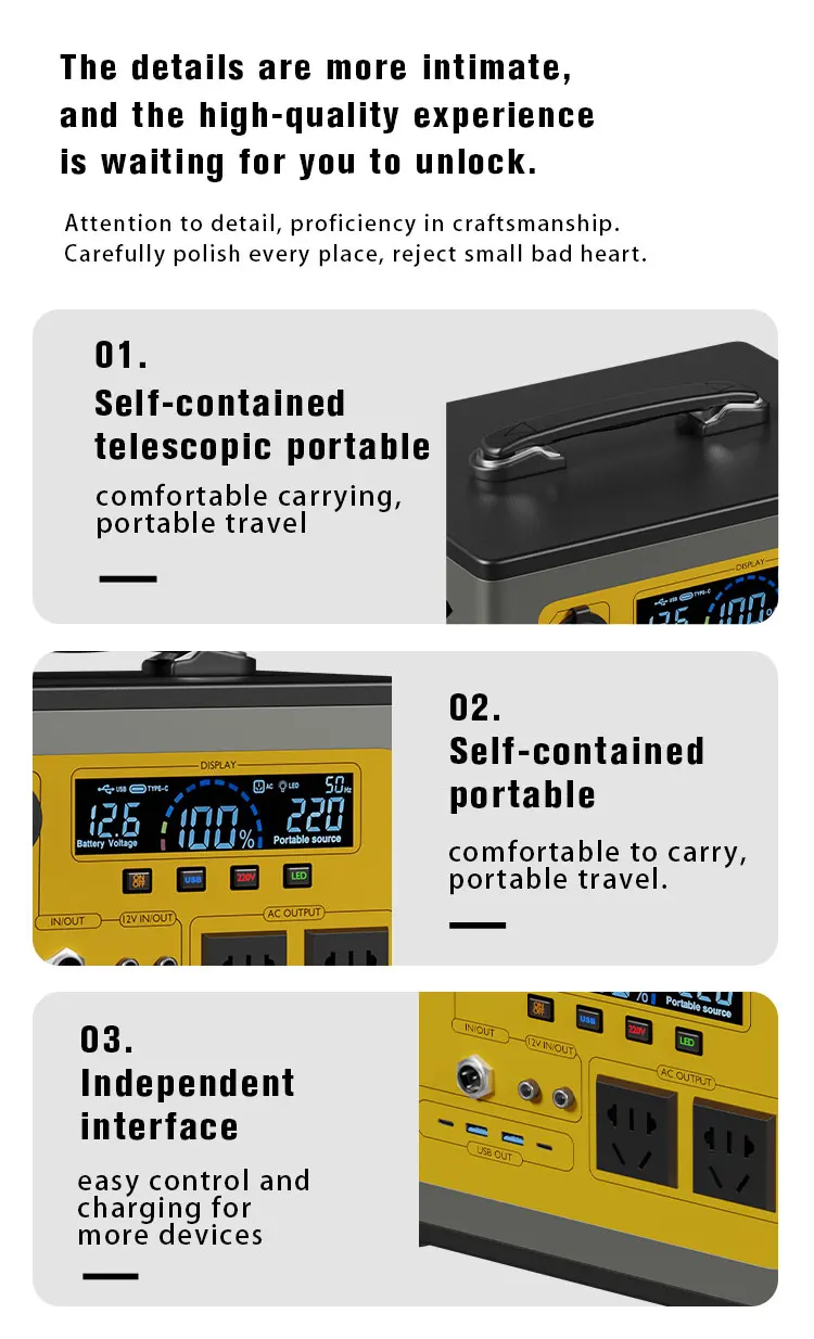 The portable power station has an extraordinary 600-watt-hour and 1200-watt-hour energy. Only using advanced components and the most advanced power management technology, it can fully power your personal electronic equipment, household electronic equipment and electrical appliances, quickly start your car, power your tools, and help you maintain lighting in an emergency, and charge your laptop and mobile phone. Portable power supply is very suitable for motorhomes, campsites, camping, hunting, farms or workplaces.