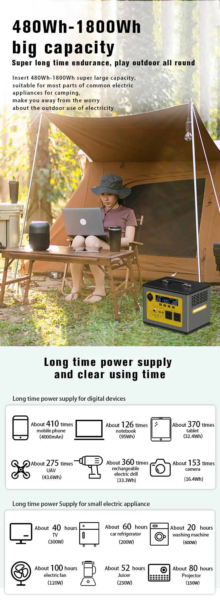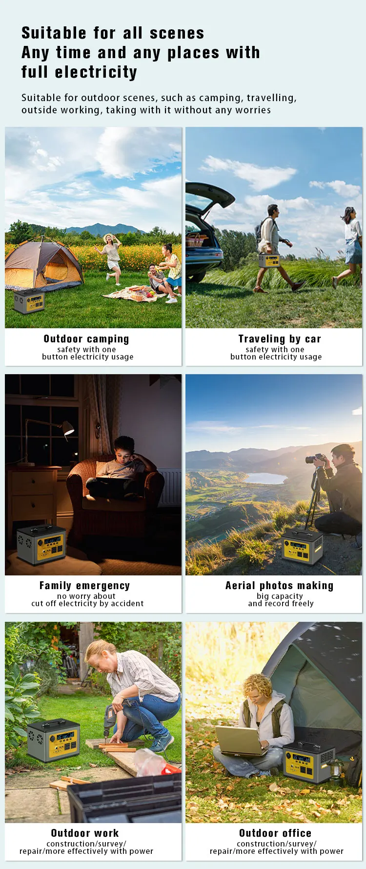 The portable emergency power supply is applicable to all household appliances, refrigerators, televisions, air conditioners, boilers, and outdoor vehicles for short time vehicle charging and camping lighting. Bring brightness to your home