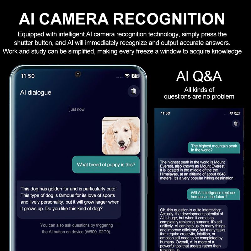 - Features: AI-powered Photo Recognition with Answers, Photography, Videography, Audio Recording, Intelligent Conversation Interaction