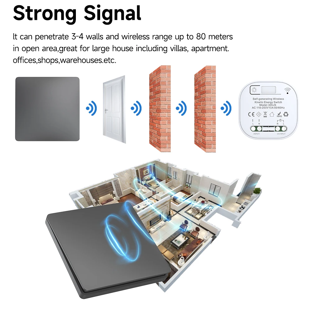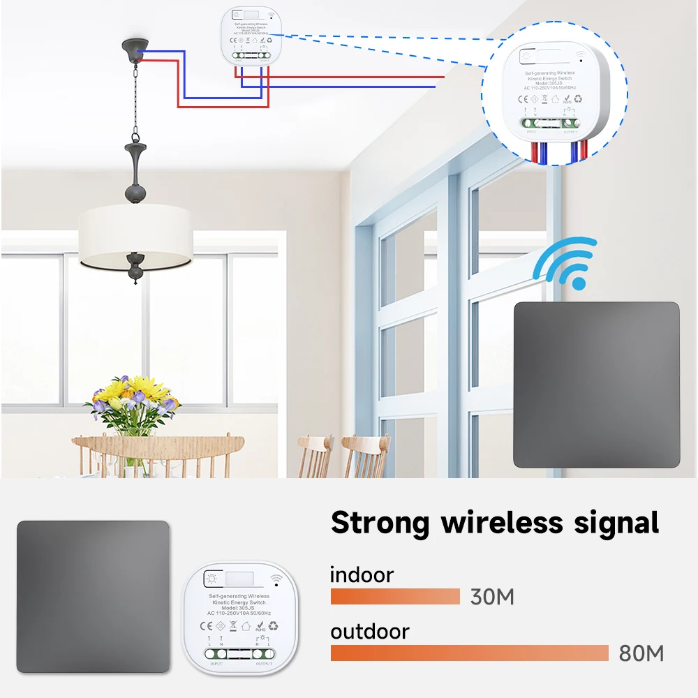 👍.3, A self powered wireless switch with strong RF signals, which can transmit strong RF signals through walls and doors to control lighting fixtures in areas around 50 meters indoors (150 meters outdoors). It is very suitable for controlling lighting fixtures in homes, garages, external lighting, and gardens.(Cannot be installed inside a metal box as metal will shield signals and cannot be used!)
