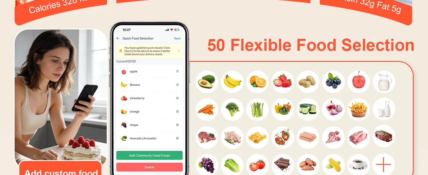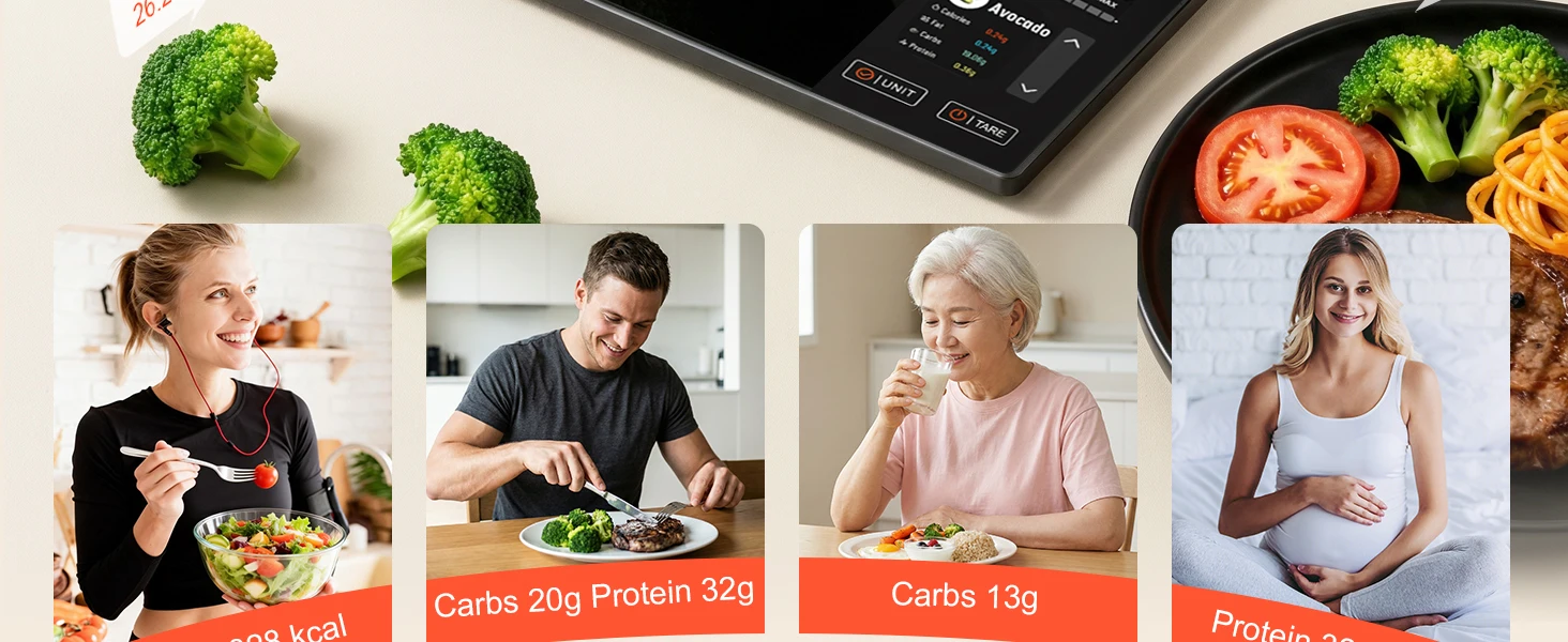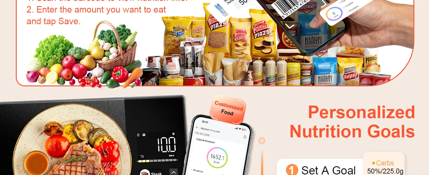 Our food scales for kitchen preloads 50 daily ingredients, connects to a 1M+ cloud food database (no manual input). Our digital food scale with the free app to automatically track core nutrients, helping you manage diet and achieve health goals easily.
