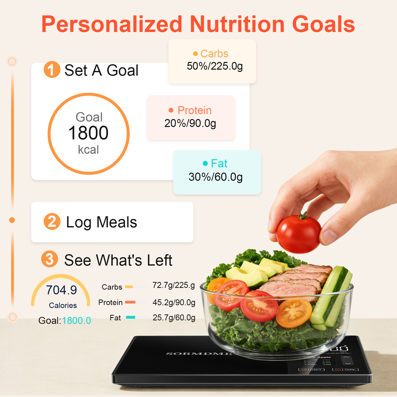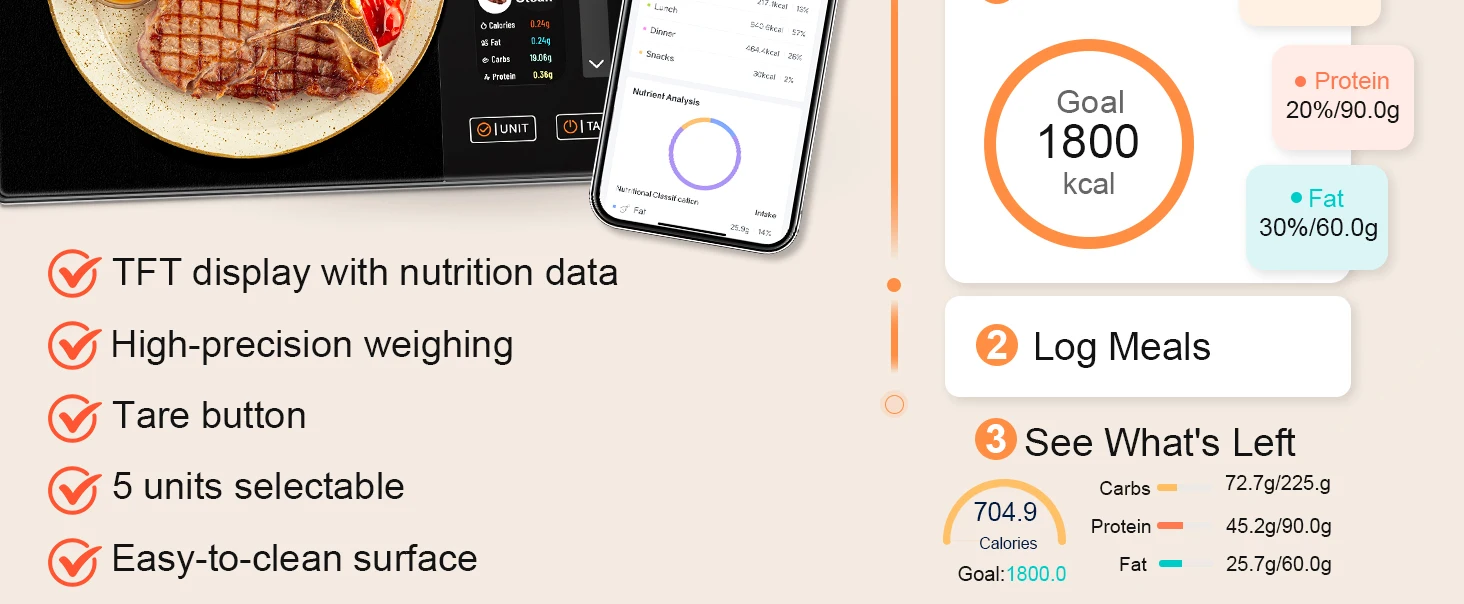 Our cooking scale has an exclusive free app, supporting single-meal nutrition calculation and daily calorie goal setting. Perfect for fitness or family health management, our smart food scale acts as your personal dietary planner.