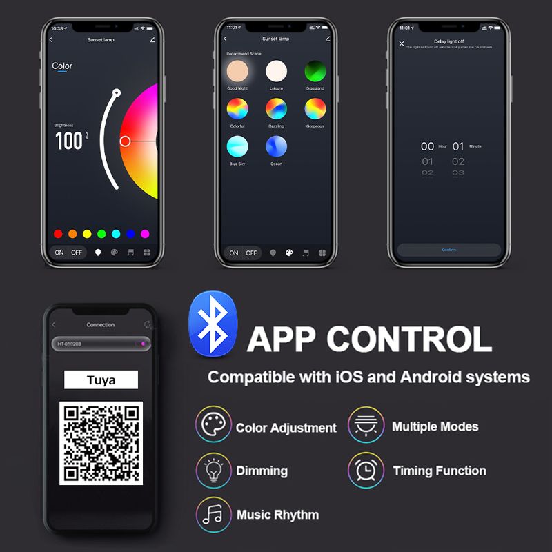 To use a smart app (Tuya or smart Life) controlled by your phone's Bluetooth function, you need to download the app. With music rhythm and countdown function. You can adjust the color or brightness on your phone. There is also an infrared remote control which can also control the light.