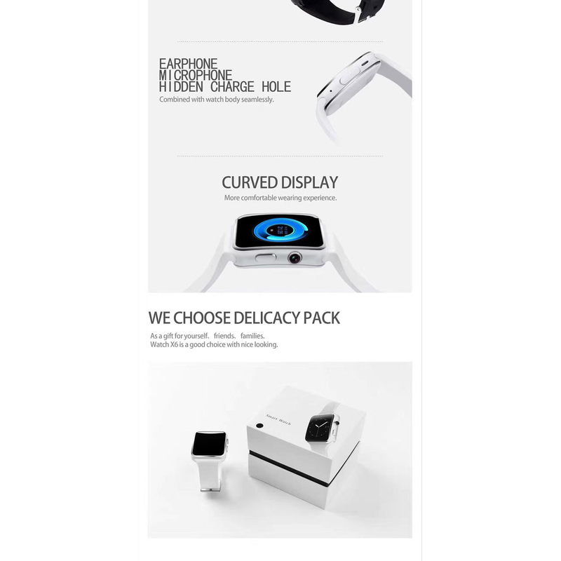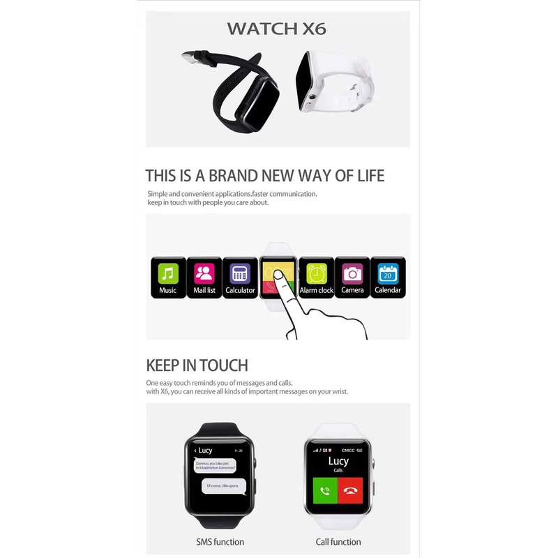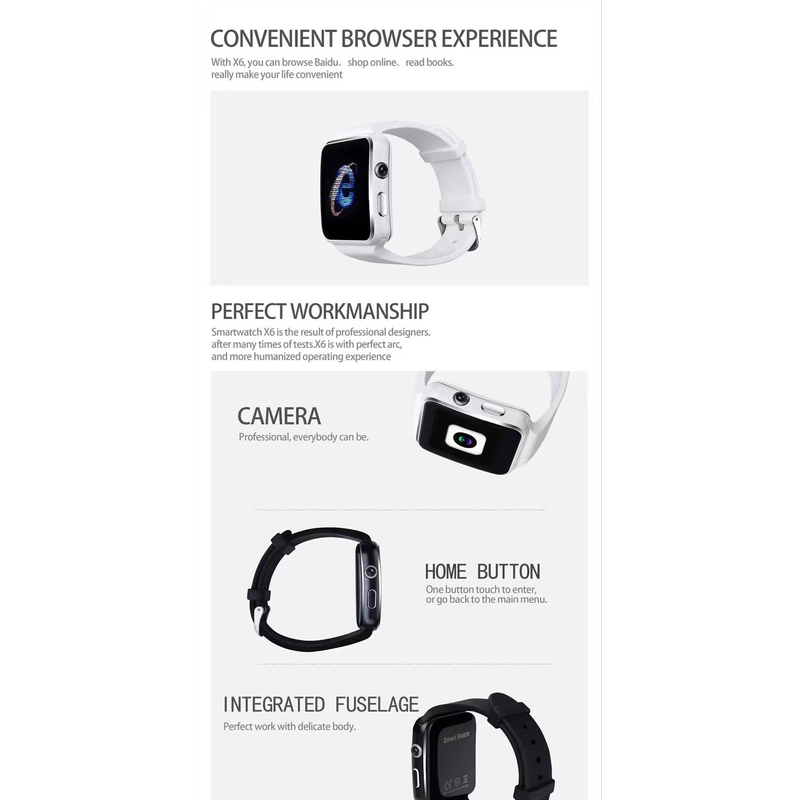 Camera: 300,000 Bluetooth version: 3.0 Color: Black Gold White Strap: silicone material Display: 1.54” inch IPS HD LCD Touch screen: OGS capacitive touch screen / 2.5D curved TP Battery type / capacity: 450mah / polymer battery Machine weight: 210g Machine size: 45.6*41.3*12.5MM Resolution: 240*240 Language: Chinese/English/Multilingual Features: Bluetooth, SIM card, phone book, dialing, information, call history, code table, Bluetooth music, photo, remote camera, set to find mobile phone, time and date, ringing vibration, pedometer, theme, clock type, sleep test, Two-way anti-lost, QQ, WeChat, GPRS positioning Facebook, Twitter, WhatsApp
