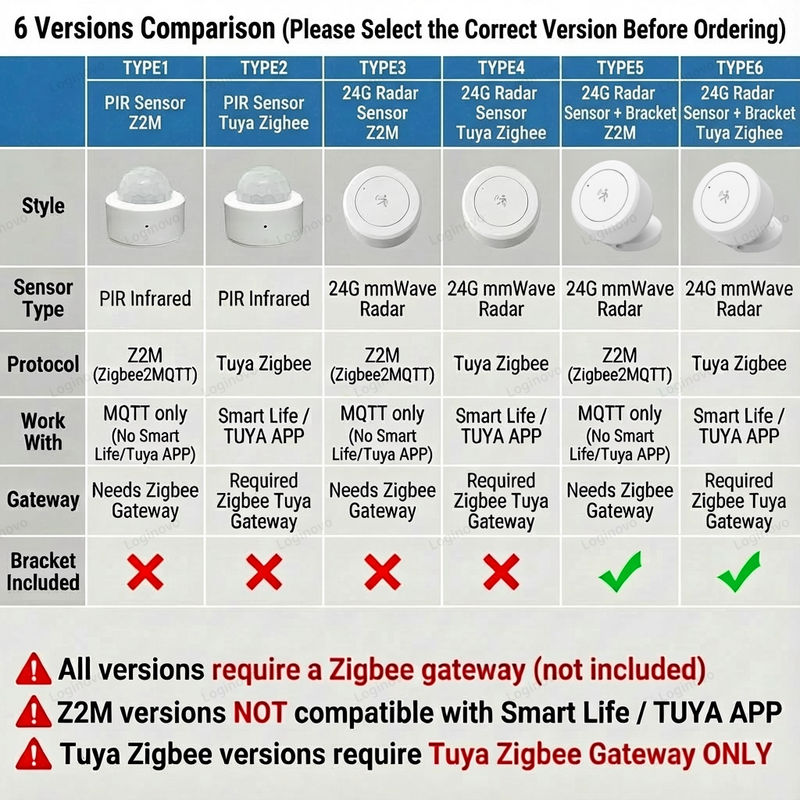 We offer 6 different models, all requiring a Zigbee hub. Please review the differences carefully to select the right version for your setup: