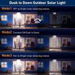 --Simply press the button on these outdoor solar lights to choose from three different modes. ①Off-to-bright: The flood lights outdoor turn on when detecting motion, and shine brightly at 100% for 25 seconds. ②Dim-to-bright: When motion is detected, the solar lights quickly brighten to 100% for 20 seconds then switch to dim at 10% brightness. ③ Constant ON:The solar deck lights stay at a dim 30% brightness all the time.