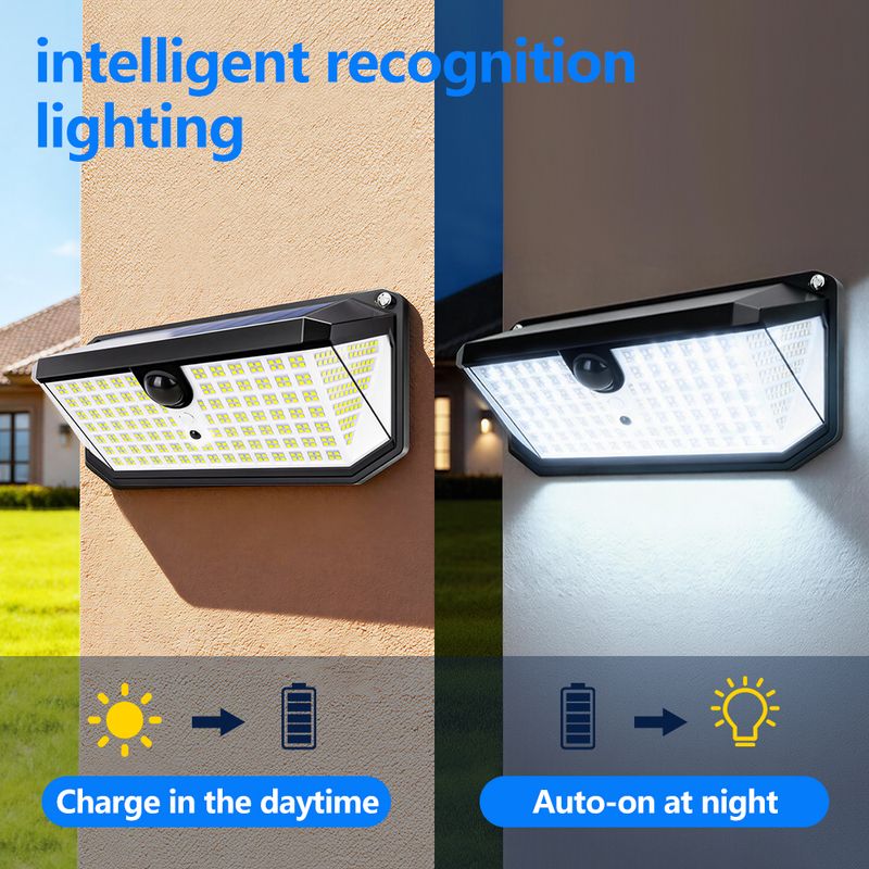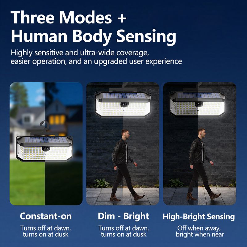 Smart Solar-Powered Design: Features intelligent light control (automatically adjusts based on ambient brightness) and relies on solar energy for eco-friendly, hassle-free charging.Three Optional Modes 1.security mode(Motion sensor turns the light on and off automatically) 2.Permanent On all night(it turns on at night and stay all night.)3.Smart brightness control(the Light stays all night and turns brighter when it detects motion)