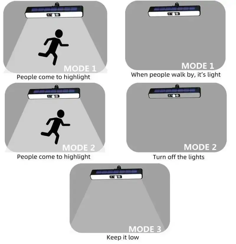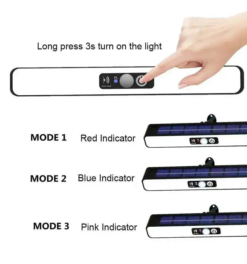 Press and hold the power button for 3s to turn on the device. Press the switch key once to switch modes. The red indicator light is the mode 1 induction mode (the light is bright when people come, and the light is dim when people leave). The blue indicator light is the mode 2 induction mode (the light is bright when people come, and the light turns off automatically after people leave). The pink indicator light is mode 3 low-brightness mode (the light is always at 30% brightness)