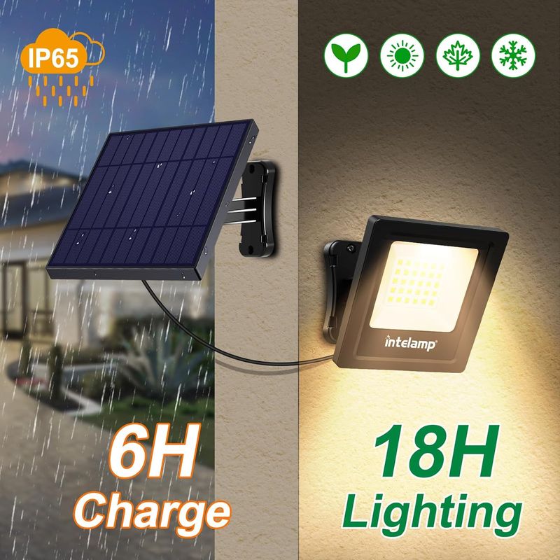 intelamp solar flood light can light up 18 hours after 6 hours directly sunshine charging.
