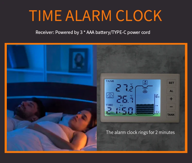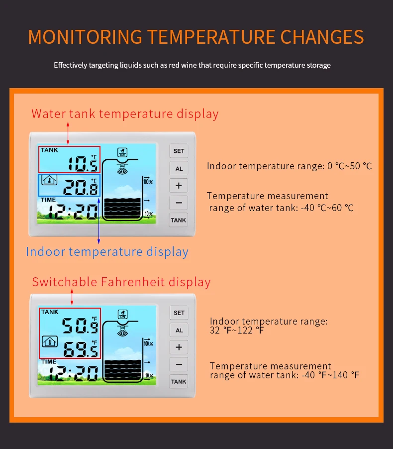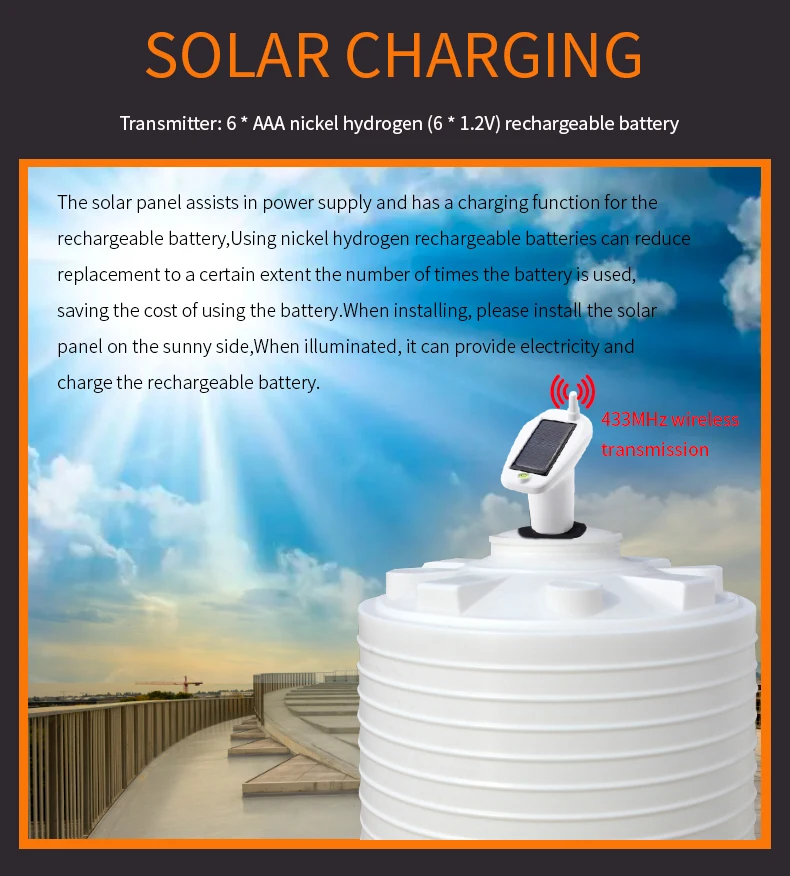 Solar Powered Ultrasonic Level Gauge Digital LCD Indoor Water Liquid Tank Depth Temperature Monitor Alarm Clock 100M Sensor -40℃