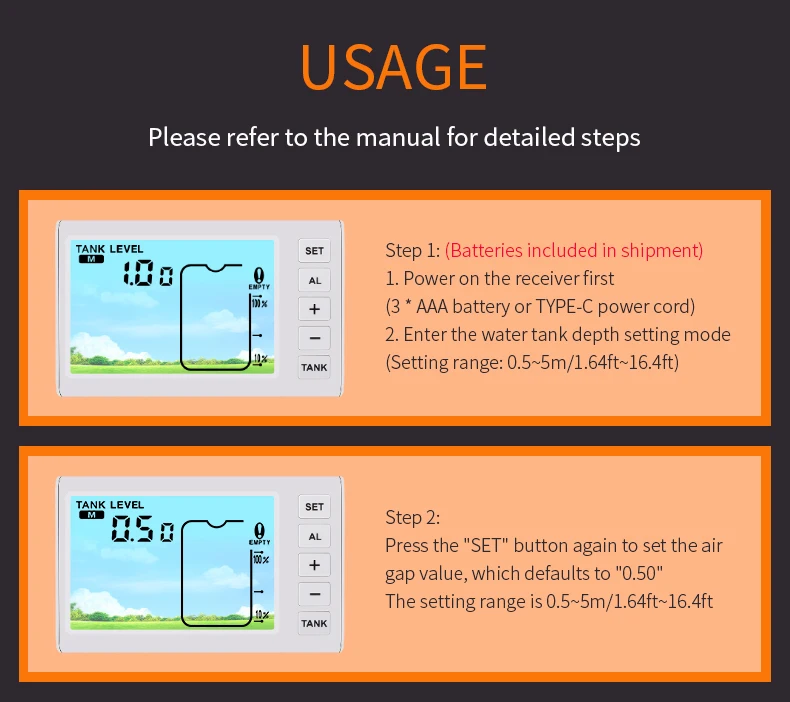 9. Tank water level display unit:metre/foot (power on default:metre)