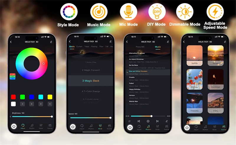 【Multi-functional Dynamic Scenes】: Multiple dynamic scenes, control the light colours through the app.