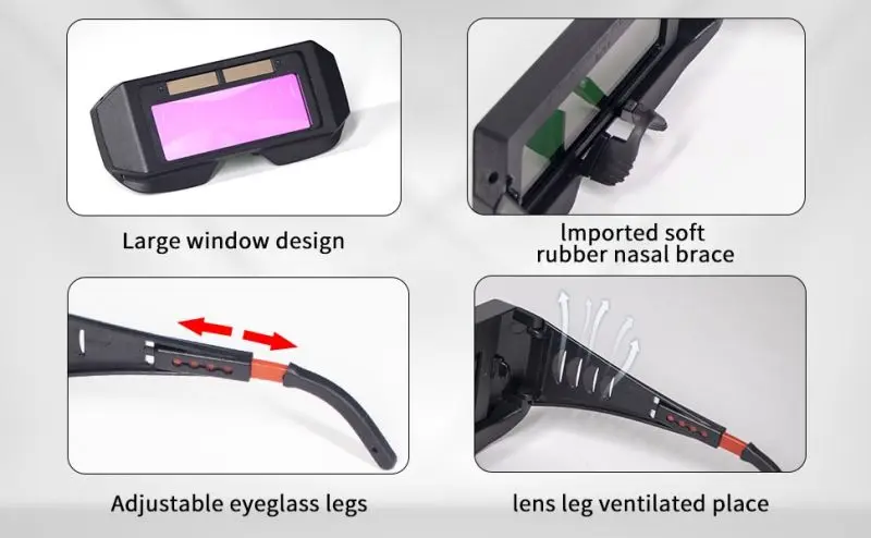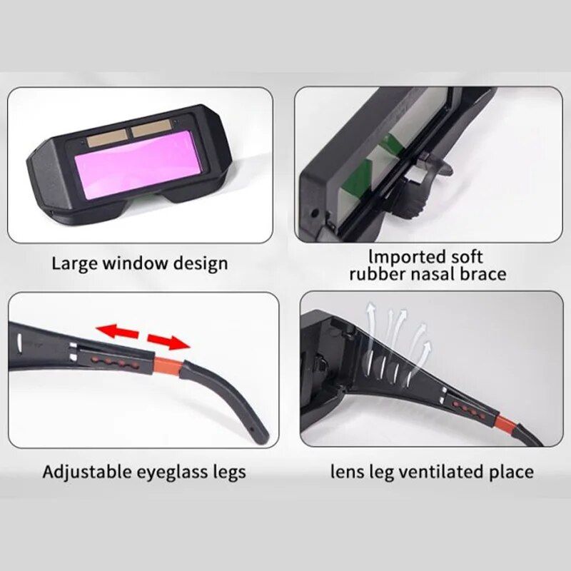 The Welding Goggles are powered by solar energy. This is convenient because you never have to replace batteries. Large window design, wider field of view.Goggles frames can be adjustable. Mirror legs can adjust the length, automatic variable light lenses lightweight and convenient, with superior impact resistance, the use of more secure and assured.