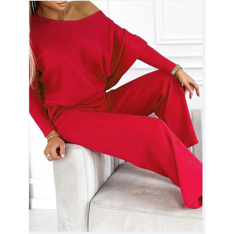 Solid Color Fashion Casual Slant Shoulder Sports Trousers Long-sleeved Suit Red XL