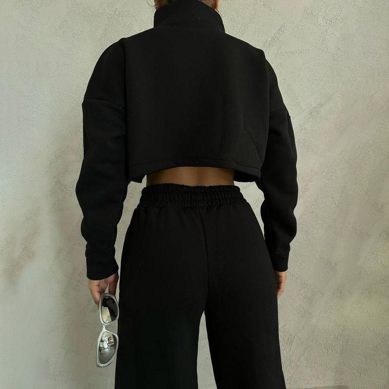 Solid Color Round Neck Pullover Long Sleeve Sweater Fashion Casual Trousers Suit Black S