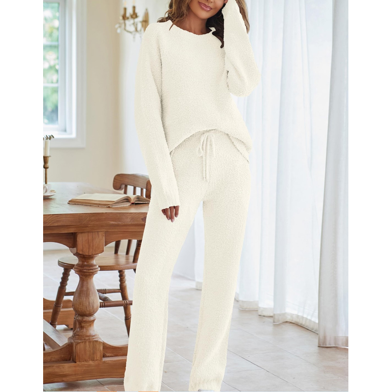 Solid Color Women's Round Neck Long Sleeve Trousers Warm Suit Beige L