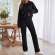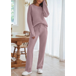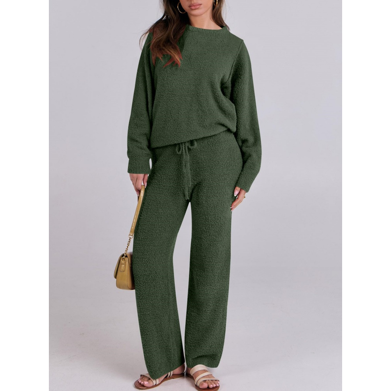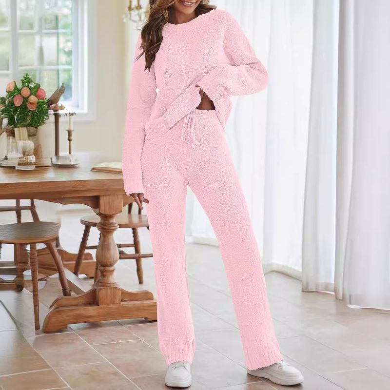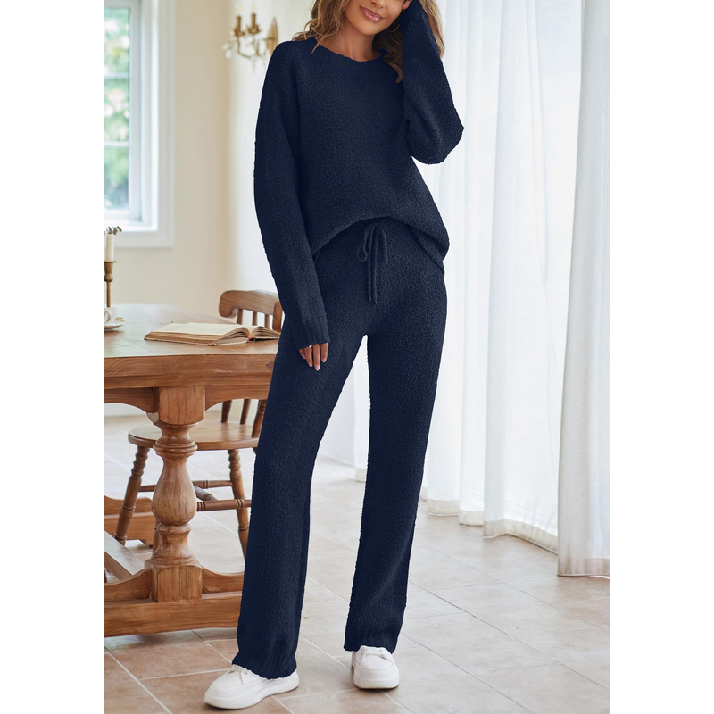 Solid Color Women's Round Neck Long Sleeve Trousers Warm Suit Dark Blue 2XL