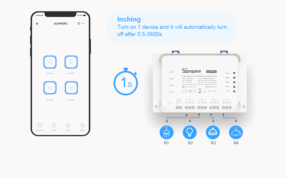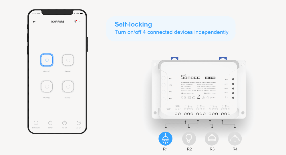 SONOFF 4CHR3 & 4CHPROR3 are both 4-gang DIY Wi-Fi Smart Switches designed to give you the ability to integrate smart control into your existing home to enable a smart home. Each smart switch has 4 gangs that can be used to control lights and other home appliances at the same time in four areas of your home. There is a major difference between 4CHR3 and 4CHPROR3, which is 4CHPROR3 is designed with an additional function for RF control. The function is purposely adopted to make you turn on/off the device connected with 4CHPROR3 via the SONOFF RM433 remote controller.