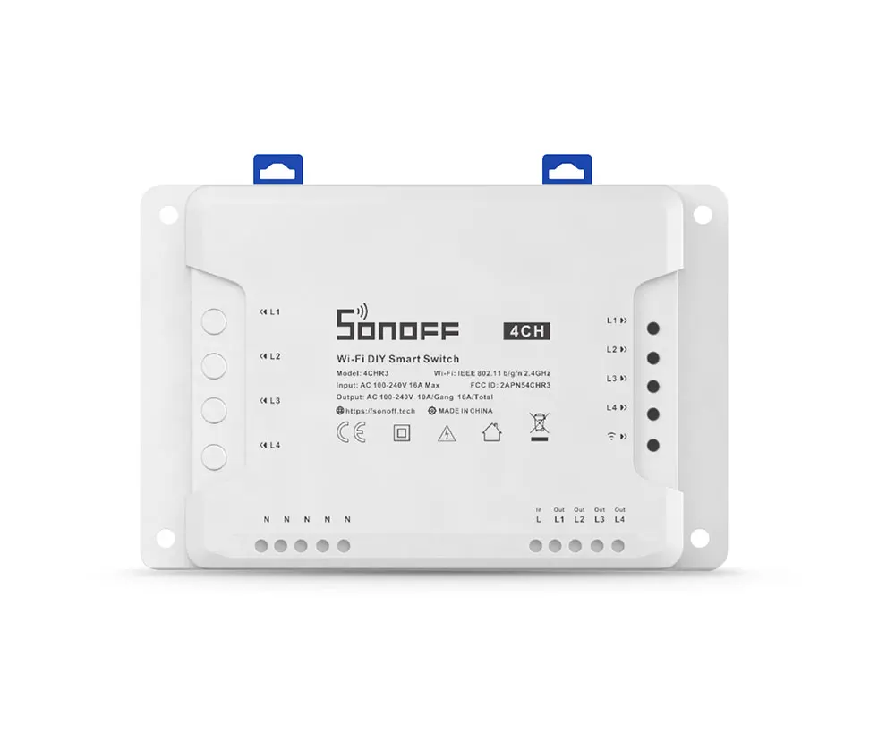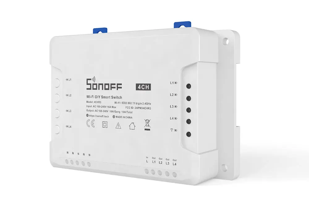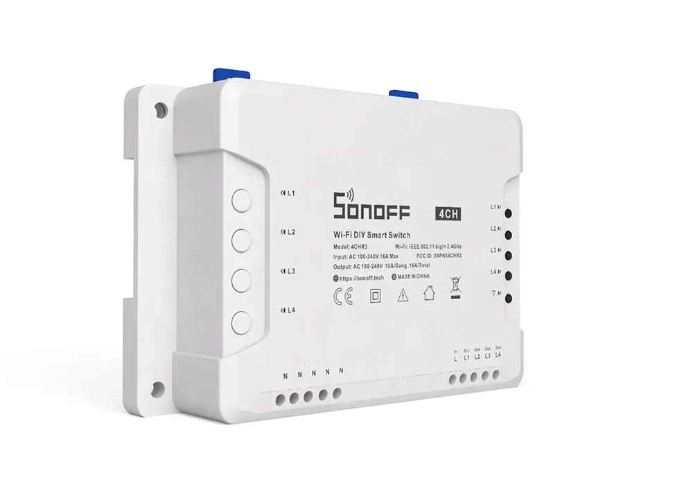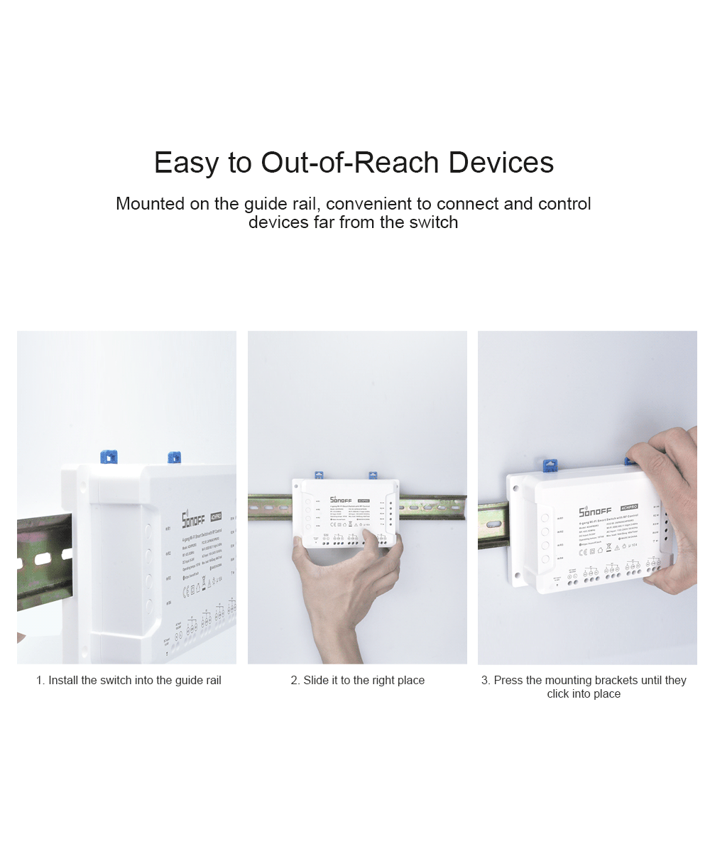 Actually, SONOFF has ever released two types of 4-gang smart switch (4CHR2 and 4CHPROR2) which comes with almost same functions with 4CHR3 and 4CHPROR3. But all the above units are still different in 3 working modes including self-locking, interlock and inching mode. The new improvement on 4CHR3 and 4CHPROR3 compared with 4CHPR2 and 4CHPROR2 is for users to set these 3 working modes on eWeLink APP instead of the hardware itself, easier to operate. So you can enable self-locking mode to turn on/off 4 connected devices separately, interlock mode to turn on 1 connected device every time and turn off the rest of devices simultaneously and inching mode to turn on 1 connected device and then make it turn off automatically after a given time (0.5 - 3600s). For the device away from the switch, you can create a moveable space in virtue of a DIN rail to make them be connected. Simply activate devices through your voice when the switch works with Alexa and Google Home smart assistant.
