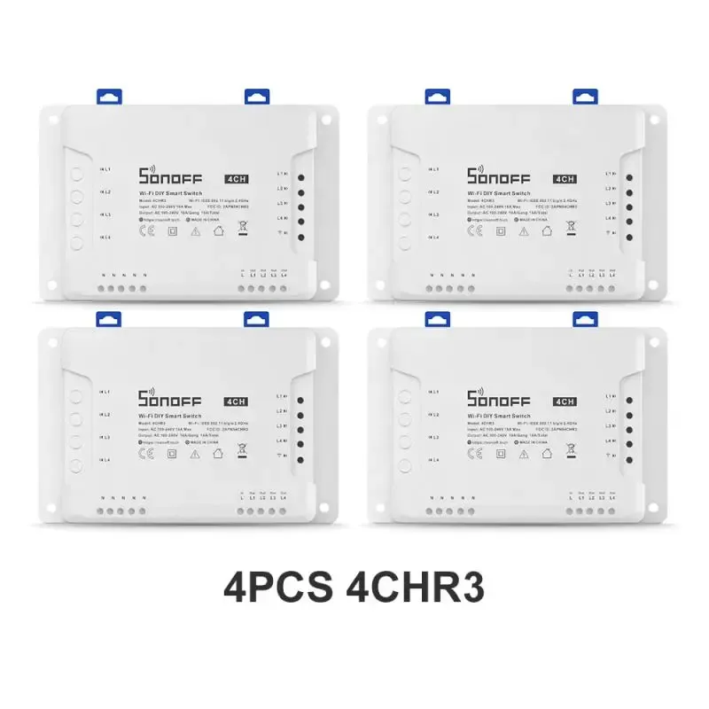 Actually, SONOFF has ever released two types of 4-gang smart switch (4CHR2 and 4CHPROR2) which comes with almost same functions with 4CHR3 and 4CHPROR3. But all the above units are still different in 3 working modes including self-locking, interlock and inching mode. The new improvement on 4CHR3 and 4CHPROR3 compared with 4CHPR2 and 4CHPROR2 is for users to set these 3 working modes on eWeLink APP instead of the hardware itself, easier to operate. So you can enable self-locking mode to turn on/off 4 connected devices separately, interlock mode to turn on 1 connected device every time and turn off the rest of devices simultaneously and inching mode to turn on 1 connected device and then make it turn off automatically after a given time (0.5 - 3600s). For the device away from the switch, you can create a moveable space in virtue of a DIN rail to make them be connected. Simply activate devices through your voice when the switch works with Alexa and Google Home smart assistant.