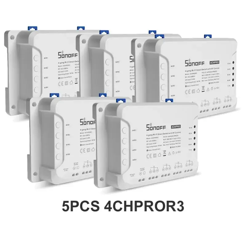 SONOFF 4CHR3 & 4CHPROR3 are both 4-gang DIY Wi-Fi Smart Switches designed to give you the ability to integrate smart control into your existing home to enable a smart home. Each smart switch has 4 gangs that can be used to control lights and other home appliances at the same time in four areas of your home. There is a major difference between 4CHR3 and 4CHPROR3, which is 4CHPROR3 is designed with an additional function for RF control. The function is purposely adopted to make you turn on/off the device connected with 4CHPROR3 via the SONOFF RM433 remote controller.
