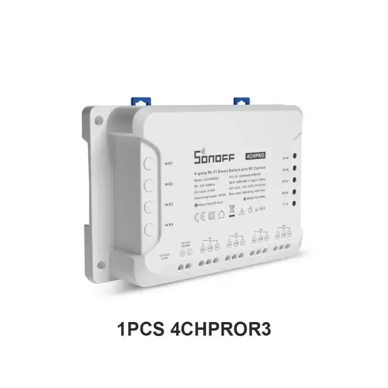 SONOFF 4CHR3 & 4CHPROR3 are both 4-gang DIY Wi-Fi Smart Switches designed to give you the ability to integrate smart control into your existing home to enable a smart home. Each smart switch has 4 gangs that can be used to control lights and other home appliances at the same time in four areas of your home. There is a major difference between 4CHR3 and 4CHPROR3, which is 4CHPROR3 is designed with an additional function for RF control. The function is purposely adopted to make you turn on/off the device connected with 4CHPROR3 via the SONOFF RM433 remote controller.