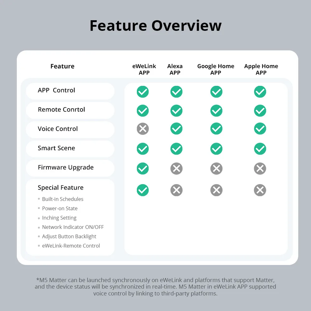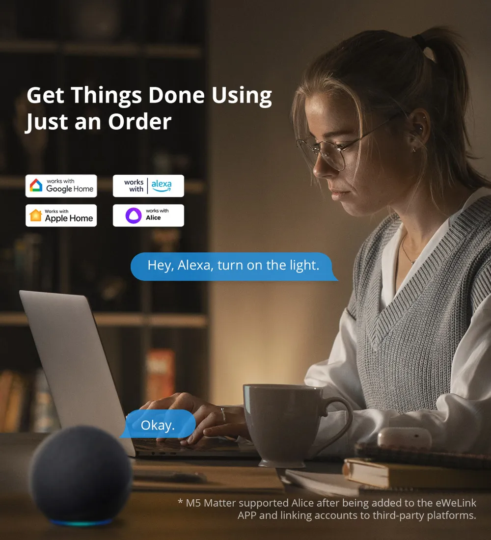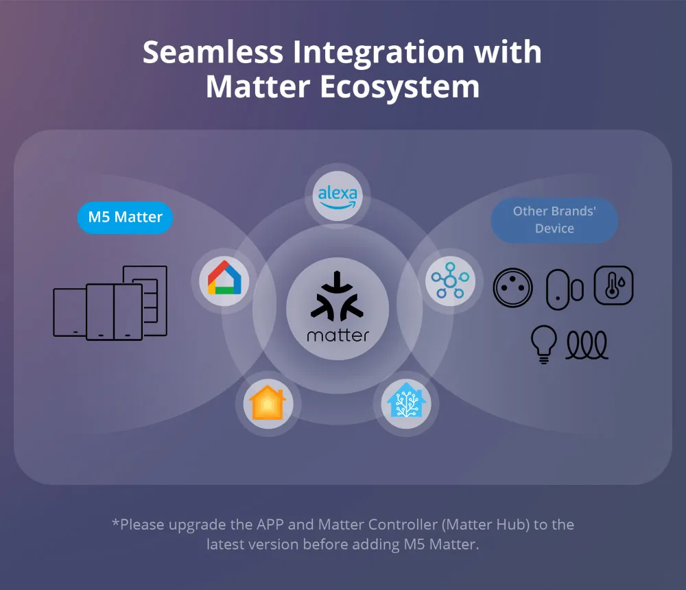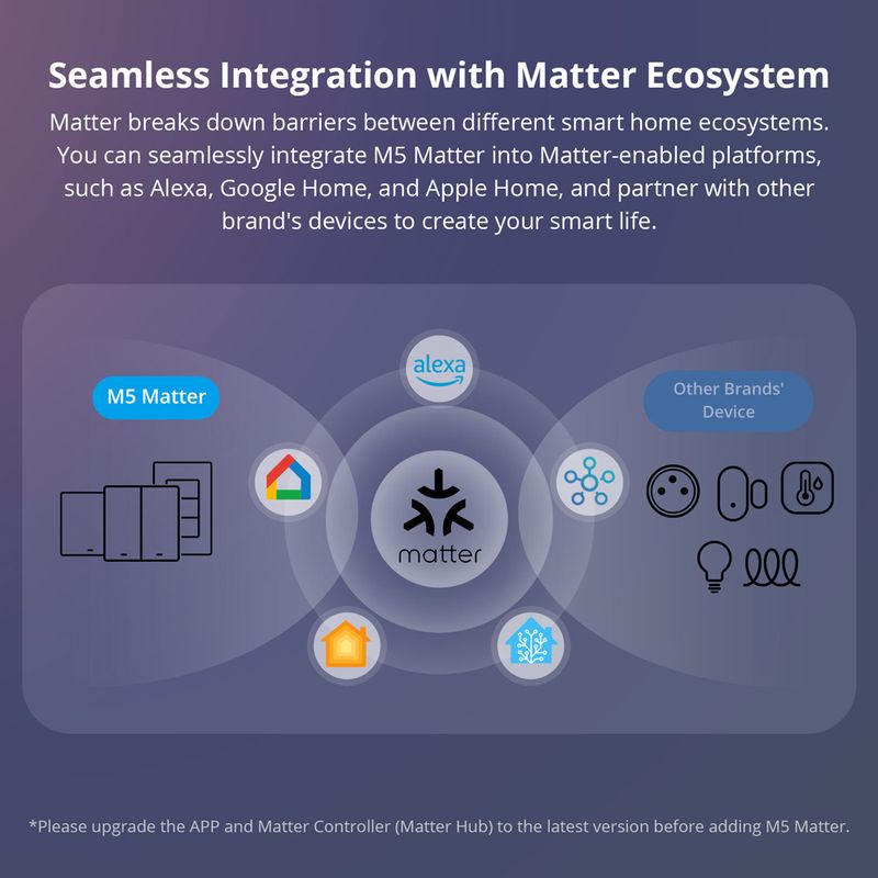 Matter breaks down barriers between different smart home ecosystems. You can seamlessly integrate M5 Matter into Matter-enabled platforms, such as Alexa, Google Home, and Apple Home, and partner with other brand’s devices to create your smart life.
