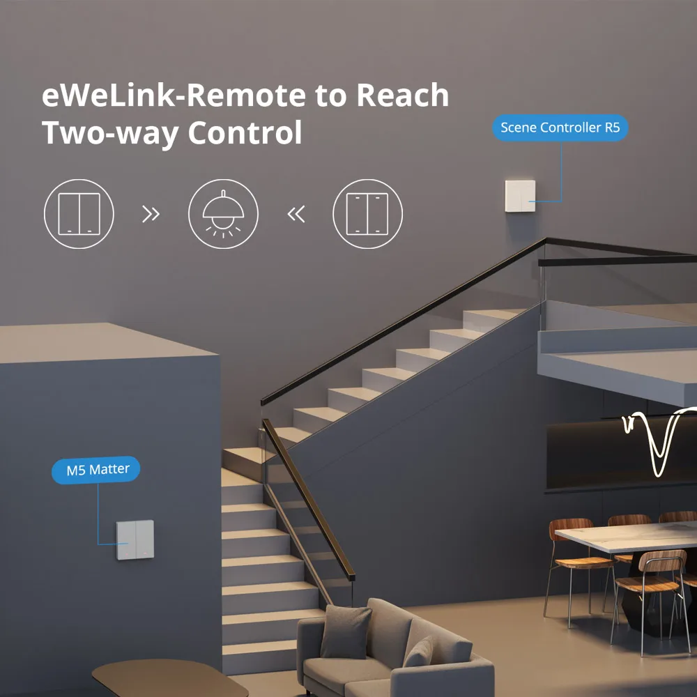M5 Matter works with NSPanel, operated on NSPanel smart scene wall switch to make you control the connected light or home appliances on a touch screen using a tap. It has the same color as NSPanel which provides a consistent decoration to match your home style. With Scene Controller R5, you can control the same light from two positions via eWeLink-Remote control. Realize two-way or multi-way control, troublesome wiring becomes a thing of the past.