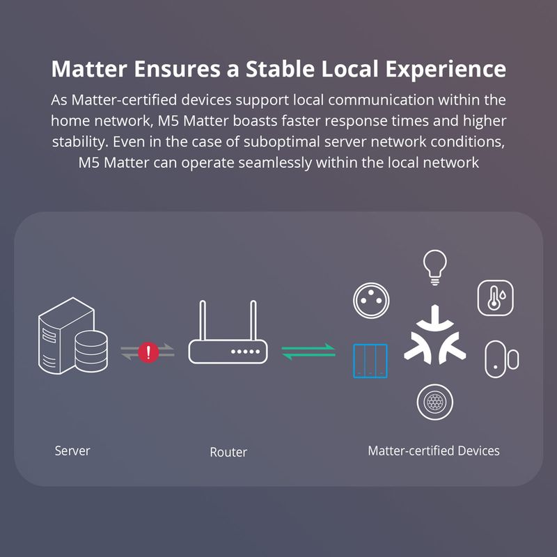 Certified by Matter, M5 Matter seamlessly integrates into Matter-enabled ecosystems like Alexa, Google Home, and Apple Home, and partners with other brand's devices to create your smart life. As Matter-certified devices support local communication within the home network, M5 Matter boasts faster response times and higher stability. Even in the case of suboptimal server network conditions, M5 Matter can operate seamlessly within the local network. Supports work with the Apple ecosystem through Matter to control M5 Matter in the Apple Home App and create automation with devices from different manufacturers.