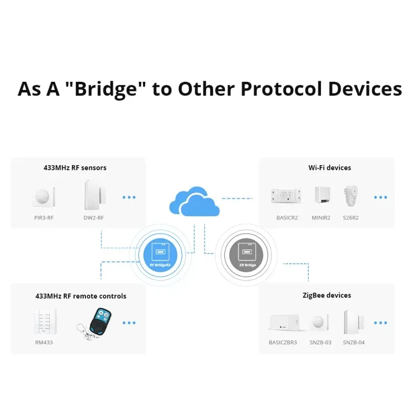 This RF BridgeR2 433 can convert most of the 433.92MHz RF Remotes into WiFi wireless. By adding the RF wireless Bridge to iOS/Android App eWeLink WiFi wirelessly, You can add up to 16 RM433 RF or alarms, also add them together (max. 16 items). One 4 button remote controller can learn 4 devices, which means 64 devices supporting 433 MHz frequency can be added on the app through WiFi/2/3/4G network.