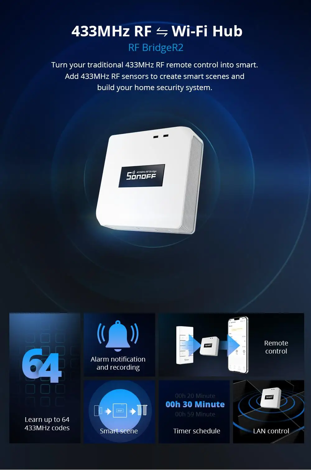 【Strong Connectivity, Limitless Possibility 】The bridge supports adding RF 433MHz devices up to 64 that SONOFF has released, like PIR3-RF PIR Motion Sensor and DW2-RF Wireless Door/Window Sensor, making your home smarter.