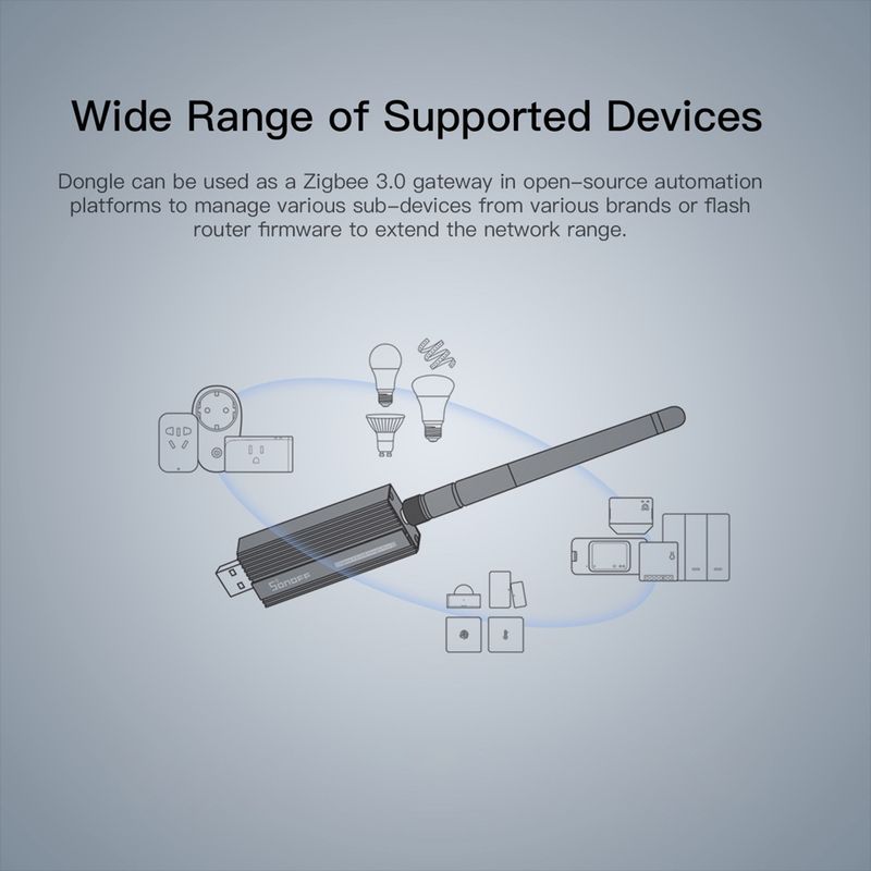 The dongle plus has a wide range of supported devices, such as SONOFF BASICZBR3, SONOFF S31 Lite zb, SONOFF SNZB01, SONOFF SNZB02, SONOFF SNZB03, SONOFF SNZB04, SONOFF ZBMINI, SONOFF S26R2ZB , and various sub-devices from various brands or flash router firmware to extend the network range.