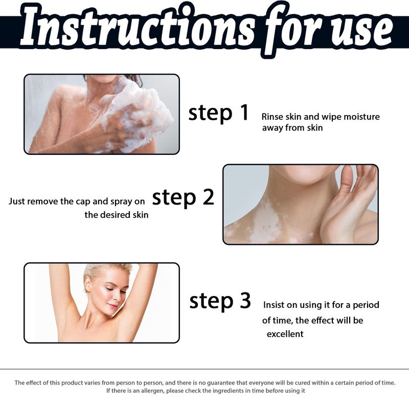 Our White Spot Clarifying Spray contains Psoralen, Angelica dahurica, and Saffron. It can improve the patient`s skin, promote a more even skin tone and reduce the appearance of white spots. It regulates skin pigmentation, repairs leukoplakia and promotes melanin recovery. It is easy to use: first rinse the skin, after that wipe off the water on the skin, remove the cap, spray on the desired skin, insist on using for a period of time, the effect will be very good. After using it, it helps to repair the white spots, moisturize the skin and promote the balance of the cells, so that the skin will also return to its original skin color.