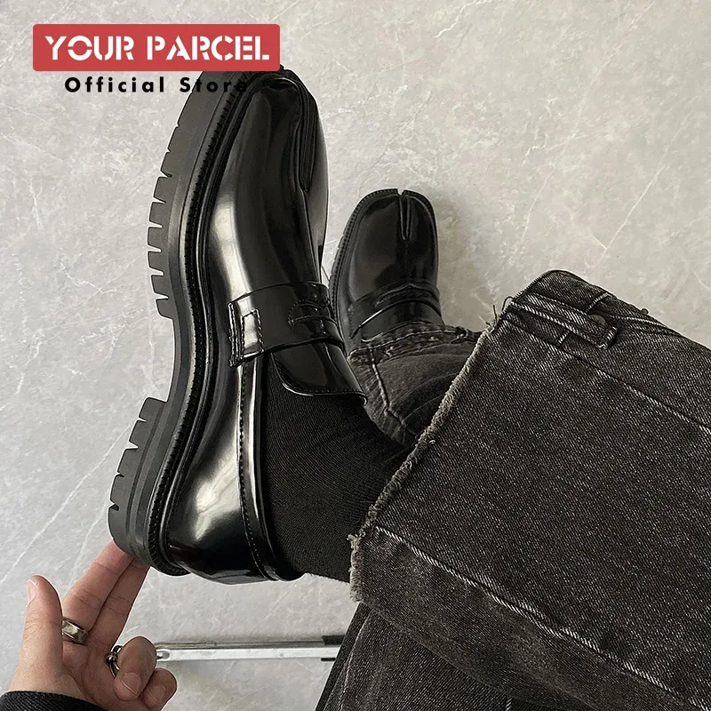 Split toe horseshoe shoes for men's thick sole Loafer shoes Tabi shoes patent leather Korean version trend casual leather shoes