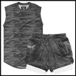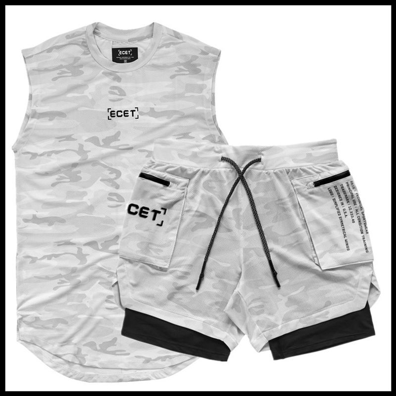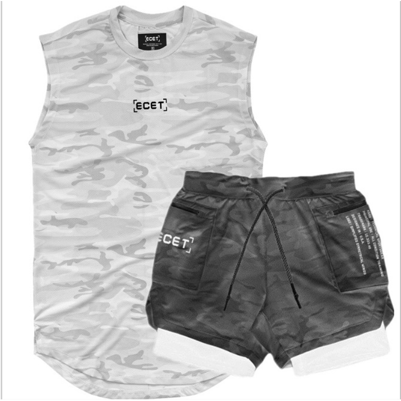 Sports Leisure Suit Muscle Fitness Training Double Layer Shorts Combination Mesh Breathable Vest Light Grey with Dark Grey L