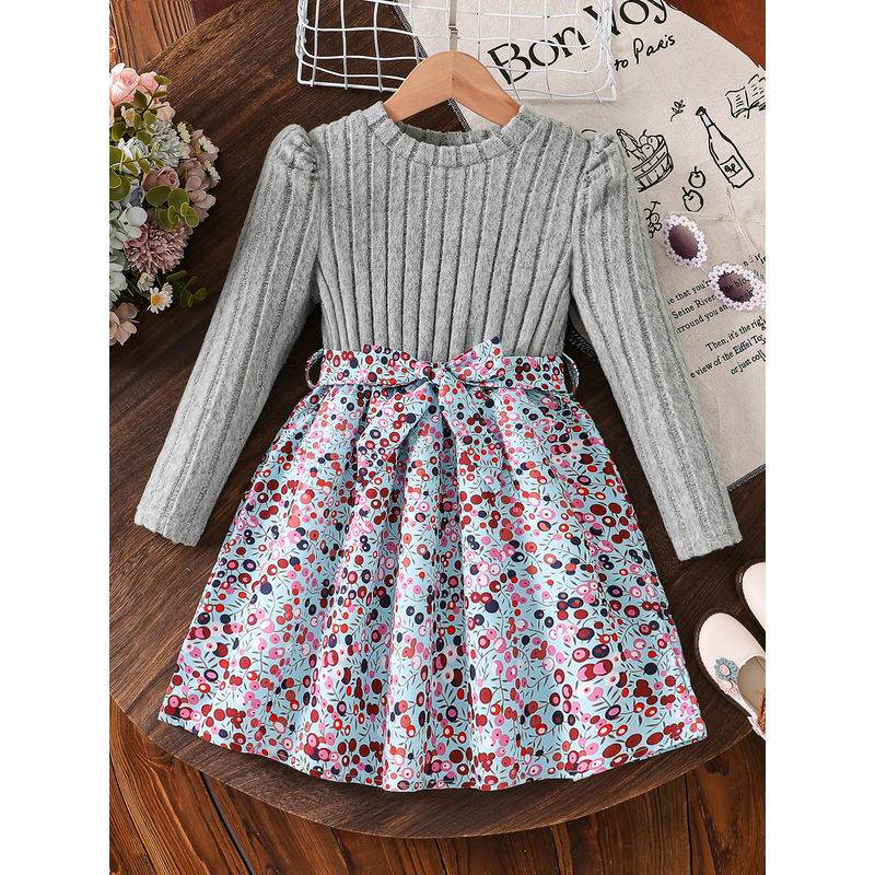 Spring and Autumn Girls' Simple Casual Versatile Knit Round-Neck Long-Sleeve Floral Dress, Everyday Casual Dress for Girls, Can Be Used as a Holiday Gift, Eid, Easter, Carnival, Chinese New Year