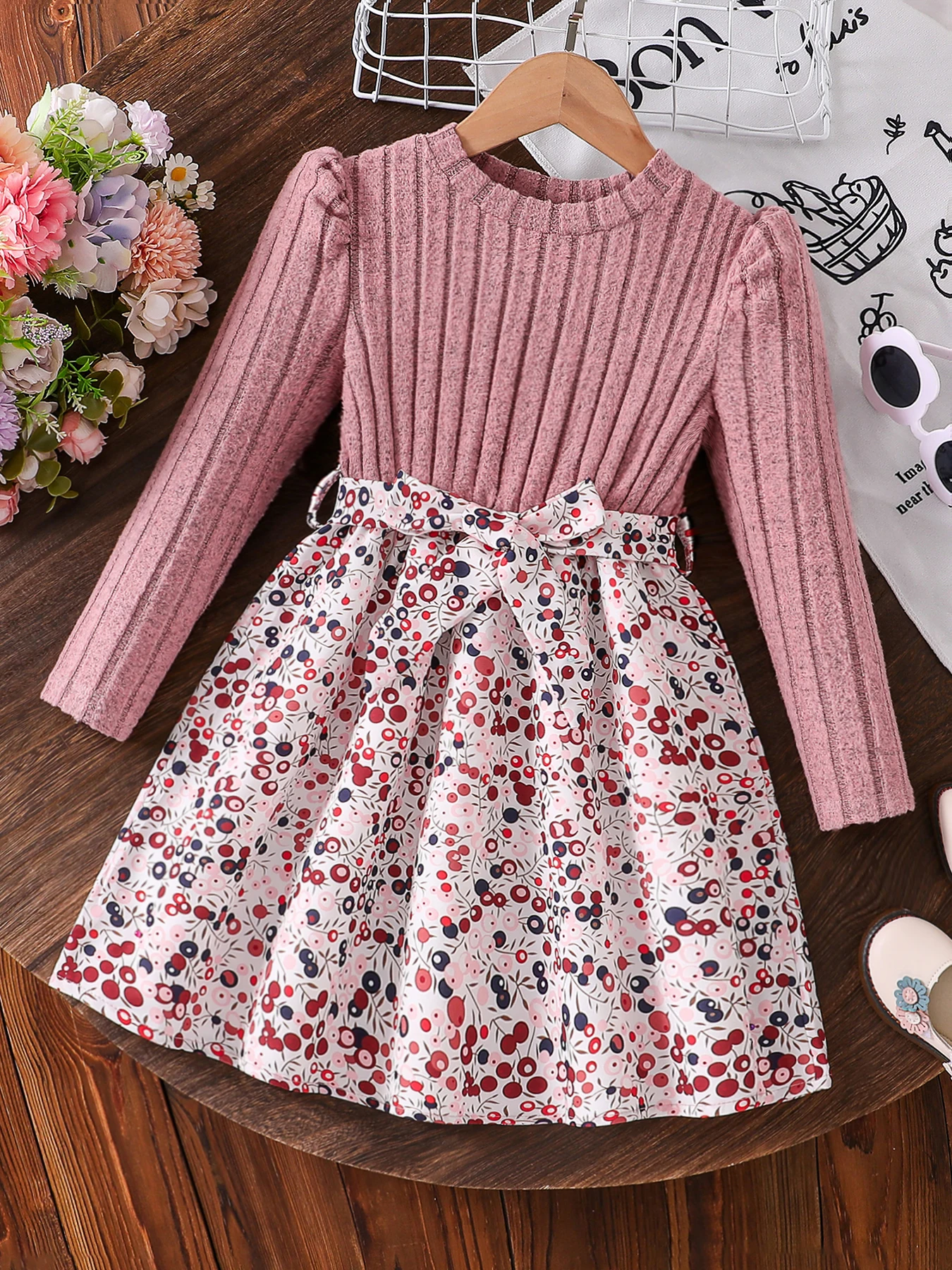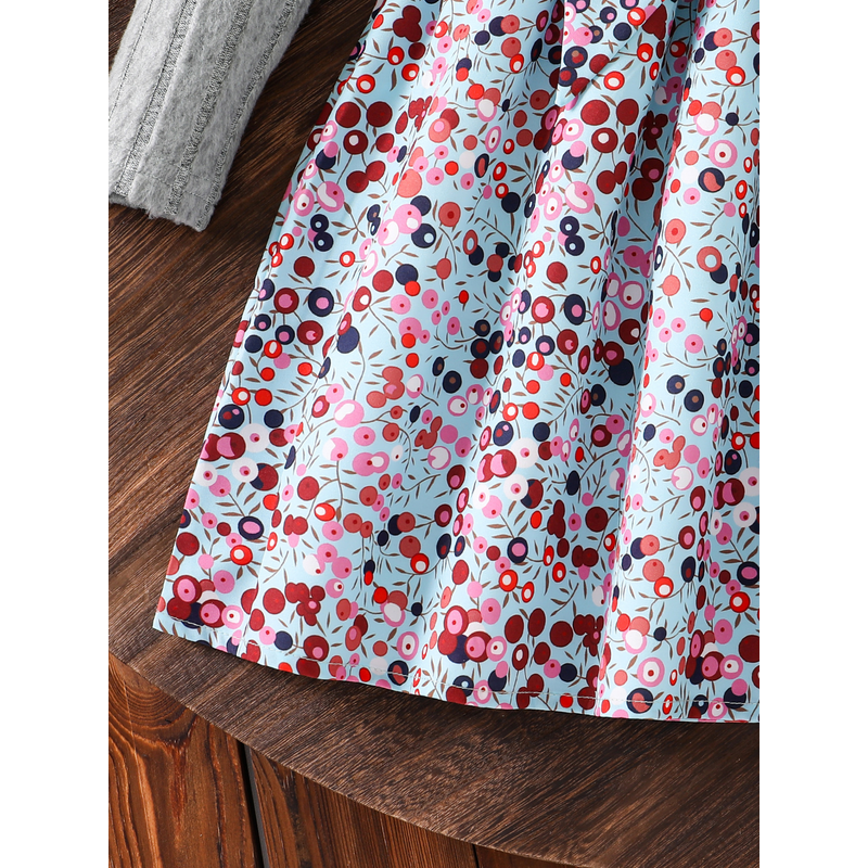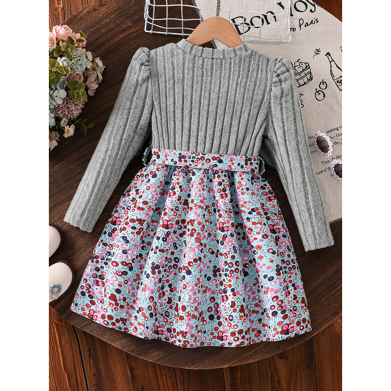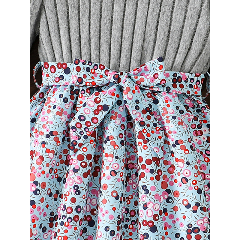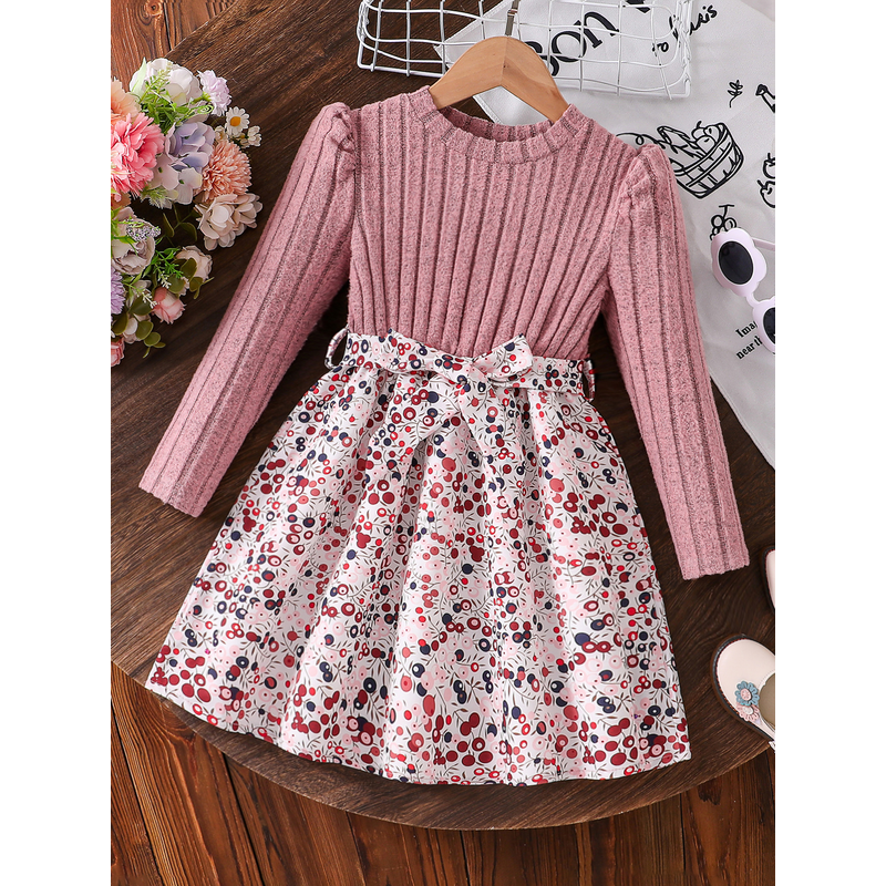 Spring and Autumn Girls' Simple Casual Versatile Knit Round-Neck Long-Sleeve Floral Dress, Everyday Casual Dress for Girls, Can Be Used as a Holiday Gift, Eid, Easter, Carnival, Chinese New Year