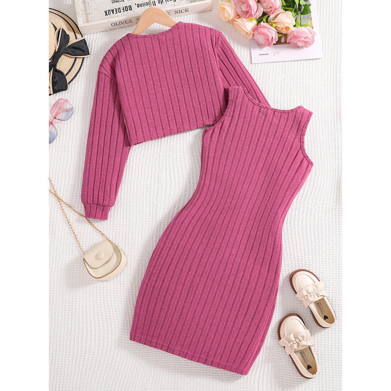 Spring and autumn new girls fashion knitwear solid color pit strip round neck long sleeve shirt sleeveless casual dress 2-piece