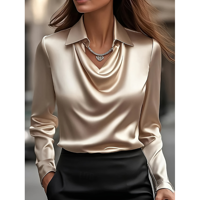 Spring and Autumn Plus-Size Long-Sleeved Satin Shirt, Round Neck with Pleated Draped Collar, Elegant and Stylish Office and Outdoor Wear Top
