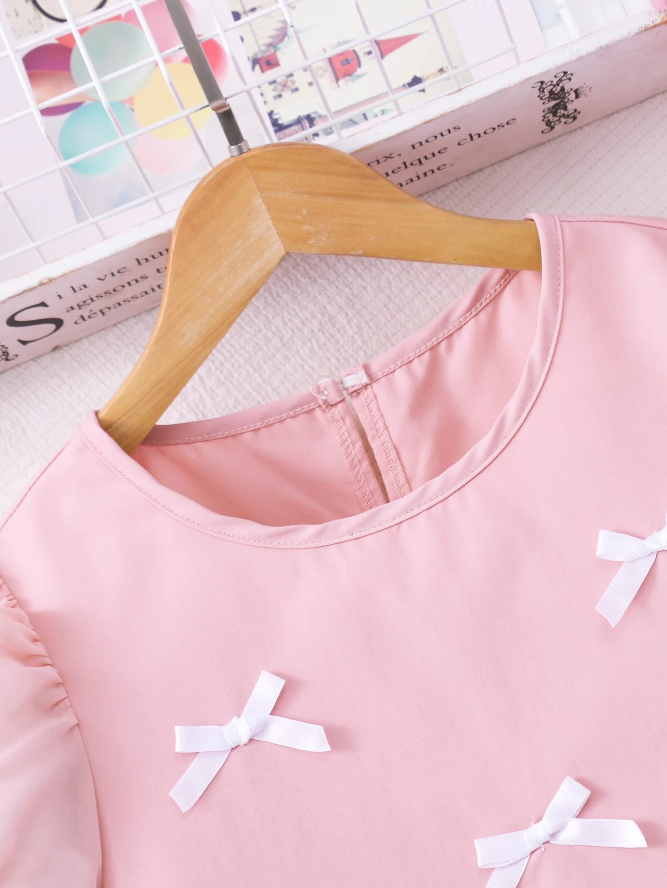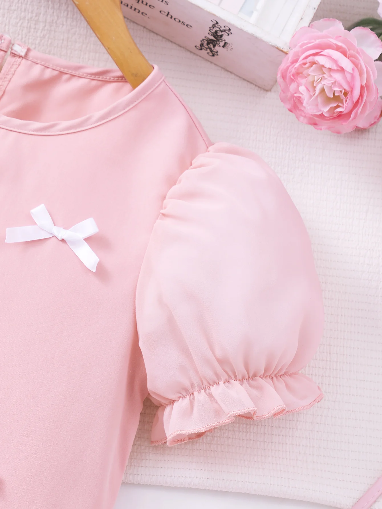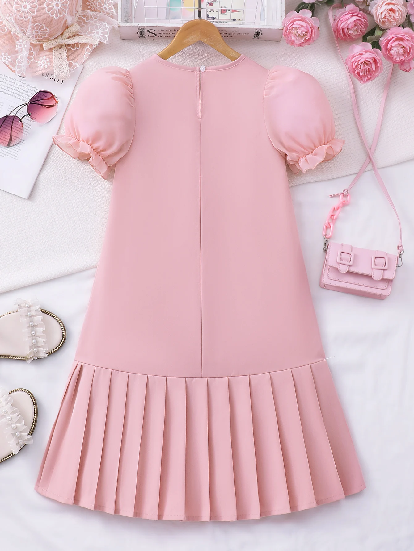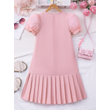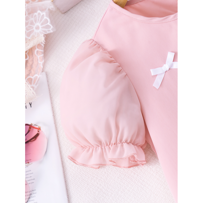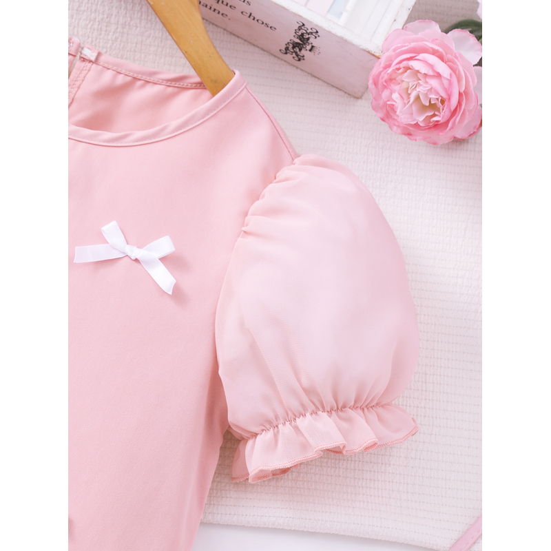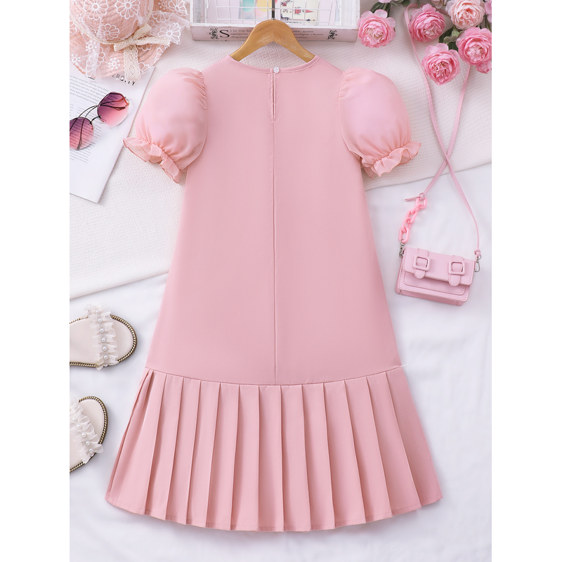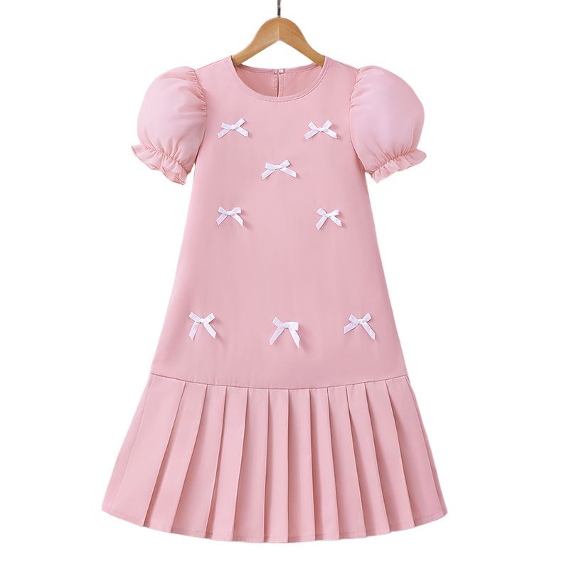Spring And Summer Women's And Children's Casual Cute, Fresh And Elegant Round Neck Lantern Sleeves Bow Solid Color Dress
