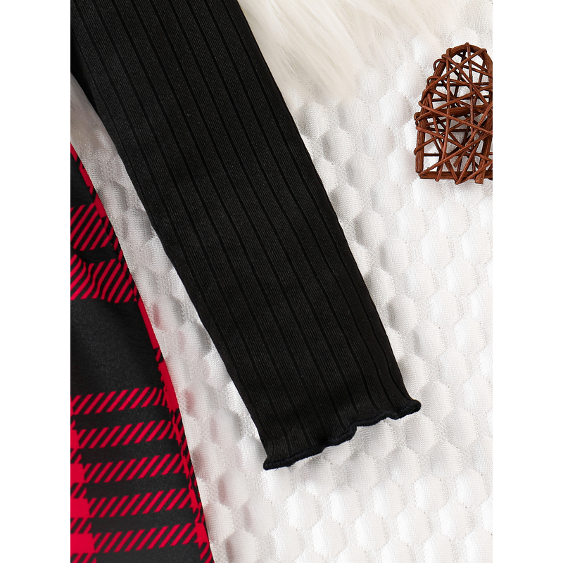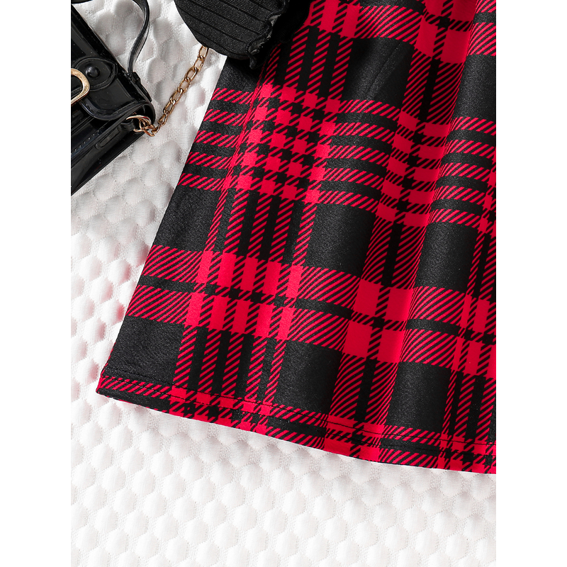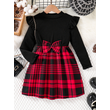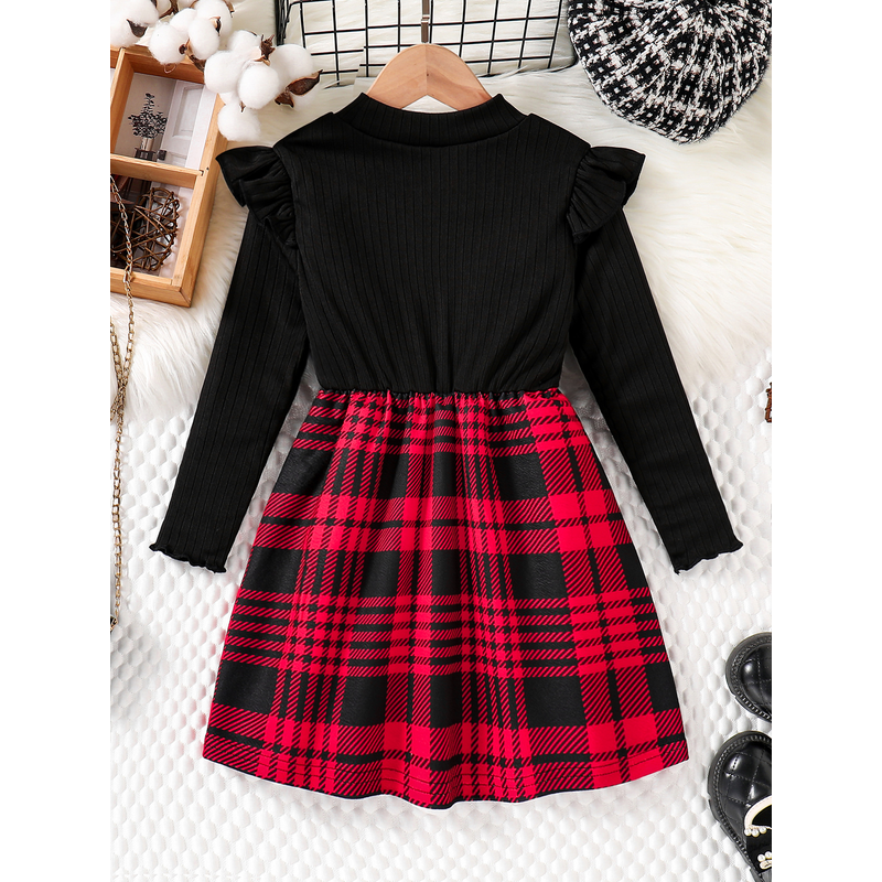 Spring & Autumn Kids Cute Fashion dress Girls Casual Solid color round neck wing sleeve shirt Red plaid skirt ceremonial dress s