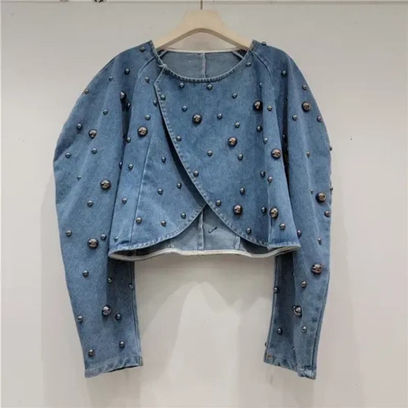 Spring Autumn Women Rivets Long Lantern Sleeve Denim Coat Short Pearls Beading Jeans Bomber Jacket Cowboy Cardigan Tops 2023