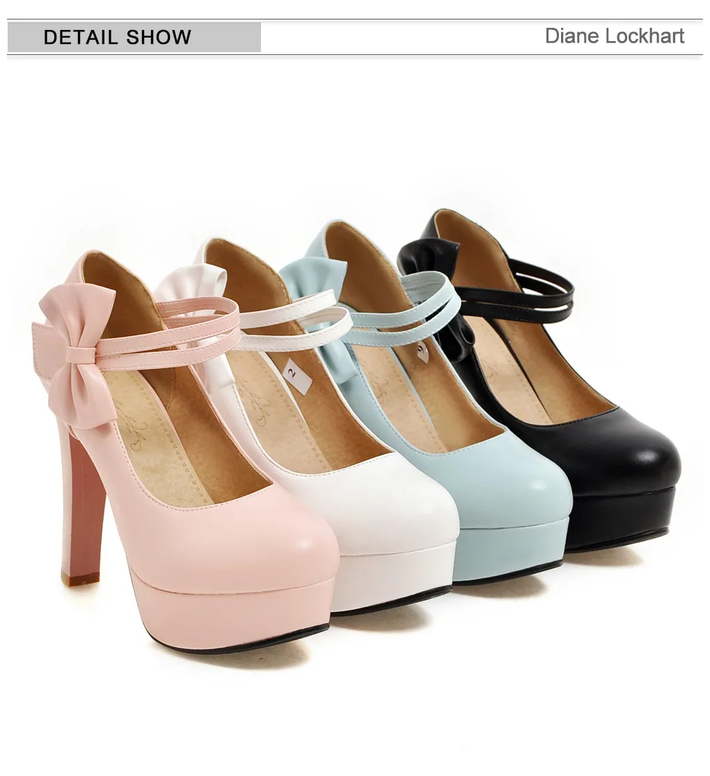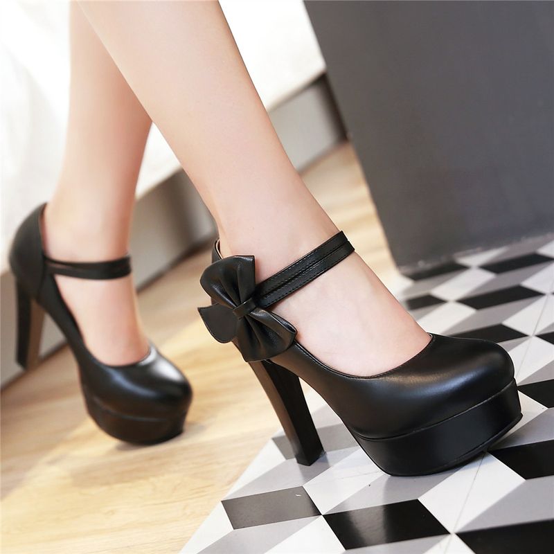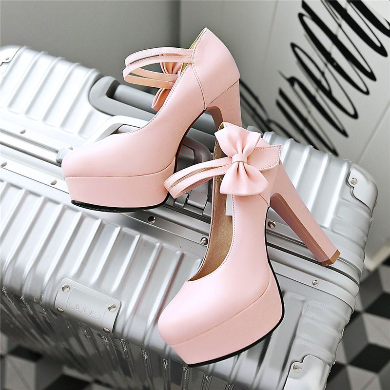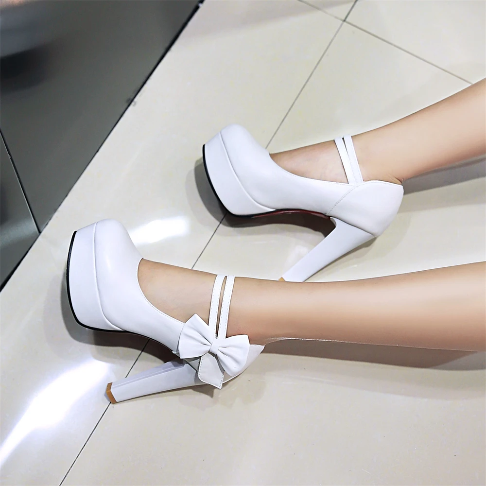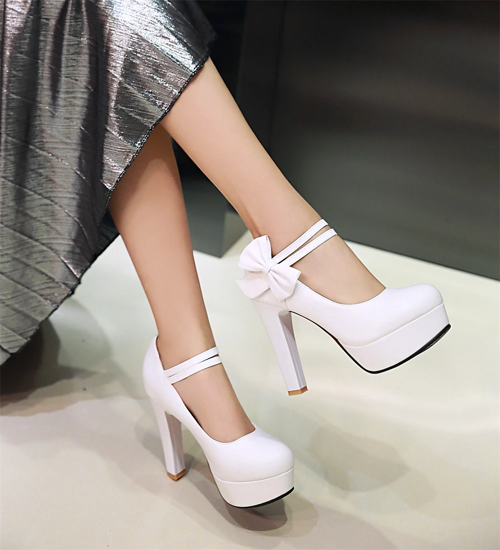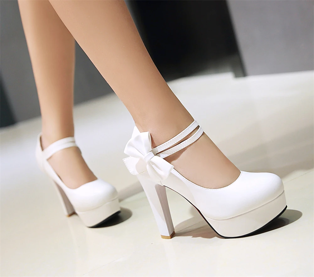 Spring High Heels Women Platform Pumps Ankle strap Shallow Mouth Single Shoes Bow Ladies High Heels White Wedding Women Shoes