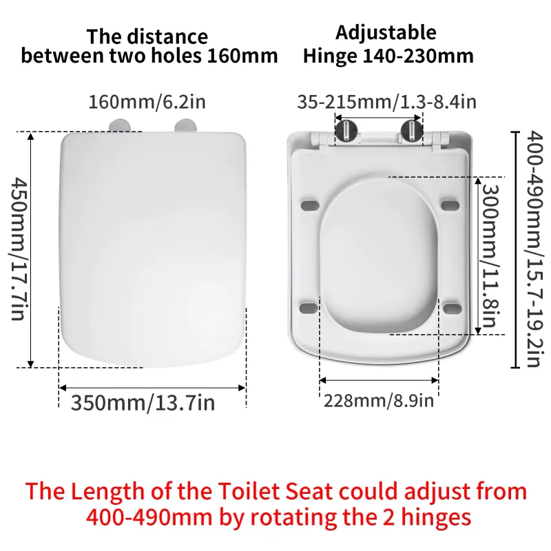 • Noise Free Soft Close: With this built-in mechanism, our square toilet seat closes down slowly. A little push and the lid come quietly and rest on the toilet seat. No more damage and banging noise, especially at night when you dont wanna disturb anyone's dream